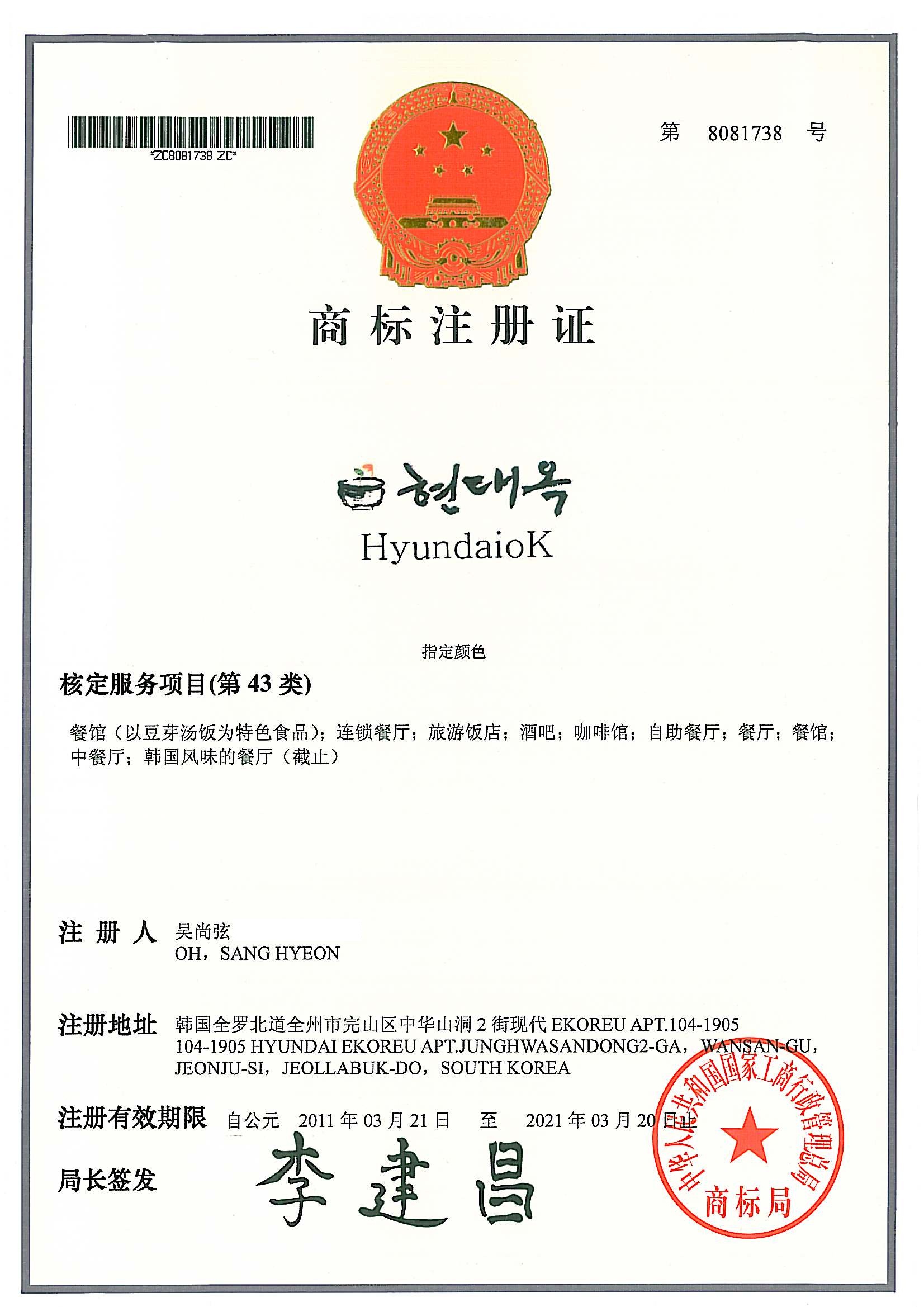 작년 출원했던 중국에서의 현대옥 상표등록증을 오늘 교부 받았습니다.