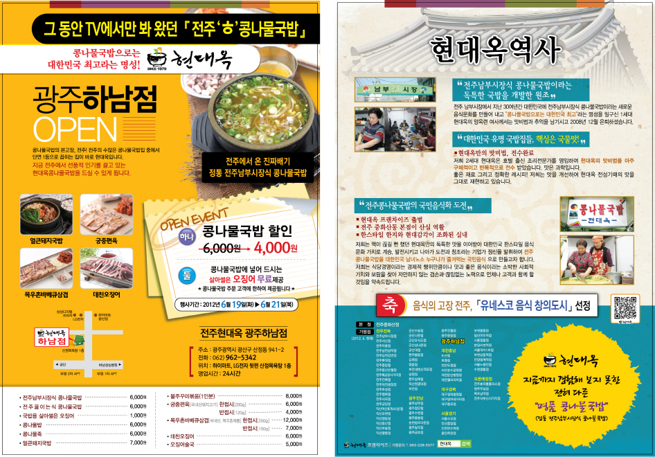지난주에 오픈한 수원영통점에이어 광주하남점에도 신메뉴(불주꾸미볶음, 콩나물밥, 콩나물죽)를 선보였으며 고객님의 반응도 매우 좋습니다. 매출도 매우 순조롭게 진행되고 있기 때문에 기대했던 매출을 훨씬 뛰어넘을것으로 생각됩니다. 광주지역은 하남점을 포함하여 모두 9곳의 현대옥이 영업중입니다. 현재도 가맹점 추가 개설이 진행중이며, 늘어난 가맹점 숫자만큼이나 본부도 막중한 책임감을 느낍니다. 광주지역의 뜨거운 성원과 열기를 발판삼아 당당히 전주콩나물국밥의 전국화를 이뤄내겠습니다!! 하남점 사장님!!! 오픈준비로 고생 많이 하셨습니다!!! 대박 기원드리며 하남점의 큰 성공을 위해 본부의 소임과 역할을 다 하겠습니다!!! ㅇ주소 : 광주광역시 광산구 산정동 941-2 ㅇ전화번호 : 062-962-5342 ㅇ위치 : 하이마트·LG전자 뒷편 산정목욕탕 1층 ## 붙임: 광주하남점 오픈전단지