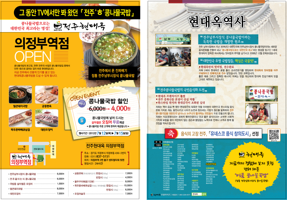 유네스코 선정 음식창의도시 전주, 전주의 명물 현대옥 콩나물국밥을 이제 의정부에서도 드실 수 있게 되었습니다. 어제 7월 12일 경기도 의정부에 위치한 현대옥 의정부역점이 성황리에 오픈하였습니다 오픈하기 며칠전부터 현수막도 걸어 놓고 기대감을 높여서인지 기다렸다는 듯이 많은 고객들께서 찾아 주셨으며, 고객님들께 보답 하고자 행사 기간동안 콩나물국밥 2,000원 할인과 국밥에넣어드시는 삶아썰은 오징어를 무료로 드리고 있습니다(행사기간 : 7/12 목요일~7/15 일요일) 의정부에는 이미 전국적으로 유명한 부대찌개 전문점들이 즐비합니다. 이제 전주 뿐만이 아니라 음식에 대한 지역적 특색이 강한곳에서도 성공해 냄으로써 전주콩나물국밥의 전국화에 한발자국 더 나아갈 수 있기를 기대합니다. 현대옥의 명성,현대옥의 맛 그리고 현대옥의 서비스 정신이 결합되어 지역민들께 사랑받는 식당이 될 수 있도록 본부차원의 노력을 다 하겠습니다!!! ㅇ주소 : 경기도 의정부시 의정부동 496-2 ㅇ전화번호 : 031-837-5151 ㅇ위치 : 의정부역 2번출구 센트럴타워 뒷편 ## 붙임: 의정부역점 오픈전단지