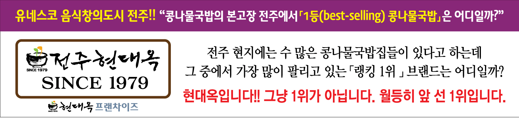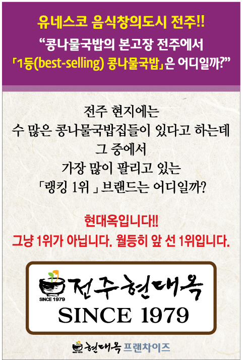 콩나물국밥의 본고장 전주에는 전국적 명성을 갖고 있는 유명 콩나물국밥식당이 몇 있습니다.당연 현대옥도 이 범주에 포함되어 있습니다. 또한 최근에는 현대옥의 성공에 자극받아 전주에서도 자생적으로 콩나물국밥 식당들이 신생하고 있으며 전국 단위 가맹사업을 목적으로 일부 브랜드가 신생되고 있기도 합니다. 최근 경기도 분당에 오픈한 어느 전주콩나물국밥집에 대한 블로그 글을 보니 실내 표현 문구들이 거의 현대옥을 모방하여 부착되어 있었습니다.저작권 문제 여부는 잘 모르겠지만 탄생부터가 모방과 현대옥짝퉁인 것이어서 '과연 그렇게 시작하고 싶었을까"하는 생각도 들고,저희 현대옥으로서는 사업적 대처를 해야 할 필요성도 갖게 됩니다.그 식당의 내부에 "전주에서 온 진짜배기"라고 쓰여 있었습니다.이 문구는 저희 현대옥이 그 간 줄곧 써 왔던 표현입니다. 30년 전통의 현대옥이 전국 가맹사업을 개시하면서 서울에 가맹점을 오픈할 경우 이 표현이 부적절하다라고 여겨 지지 않았고 당연 자부심과 사명감의 발로였던 것입니다. 이제 좀 더 적극적인 마케팅을 구사하고자 합니다. 이 시간 현재 전주에서 가장 많이 팔리고 있는 콩나물국밥 브랜드는 어디일까? 당연 현대옥입니다.전주 현지 시민들께 물어 보면 단박에 알 수 있습니다.전주 이외의 지역에서는 전주의 현실을 거의 잘 모릅니다.현대옥도 모르고 계시는 국민이 태반입니다.이런 형국에서 전주 에서의 저희 현대옥의 위상을 적극적으로 알려 내는 것도 당연한 기업활동이라고 판단하면서 아래의 붙임과 같은 새로운 실내 부착물을 공지하오니 전국의 가맹점에서는 웹하드에서 파일을 다운받아 자체 제작하여 실내에 적극적으로 부착하시기 바랍니다. 세로형이 기존 실내 부착용 포멕스 재질의 것과 그 크기이며 가로형은 세로형 부착이 여의치 않을 경우 실내 적절한 곳에 현수막으로 게시하는 것입니다.