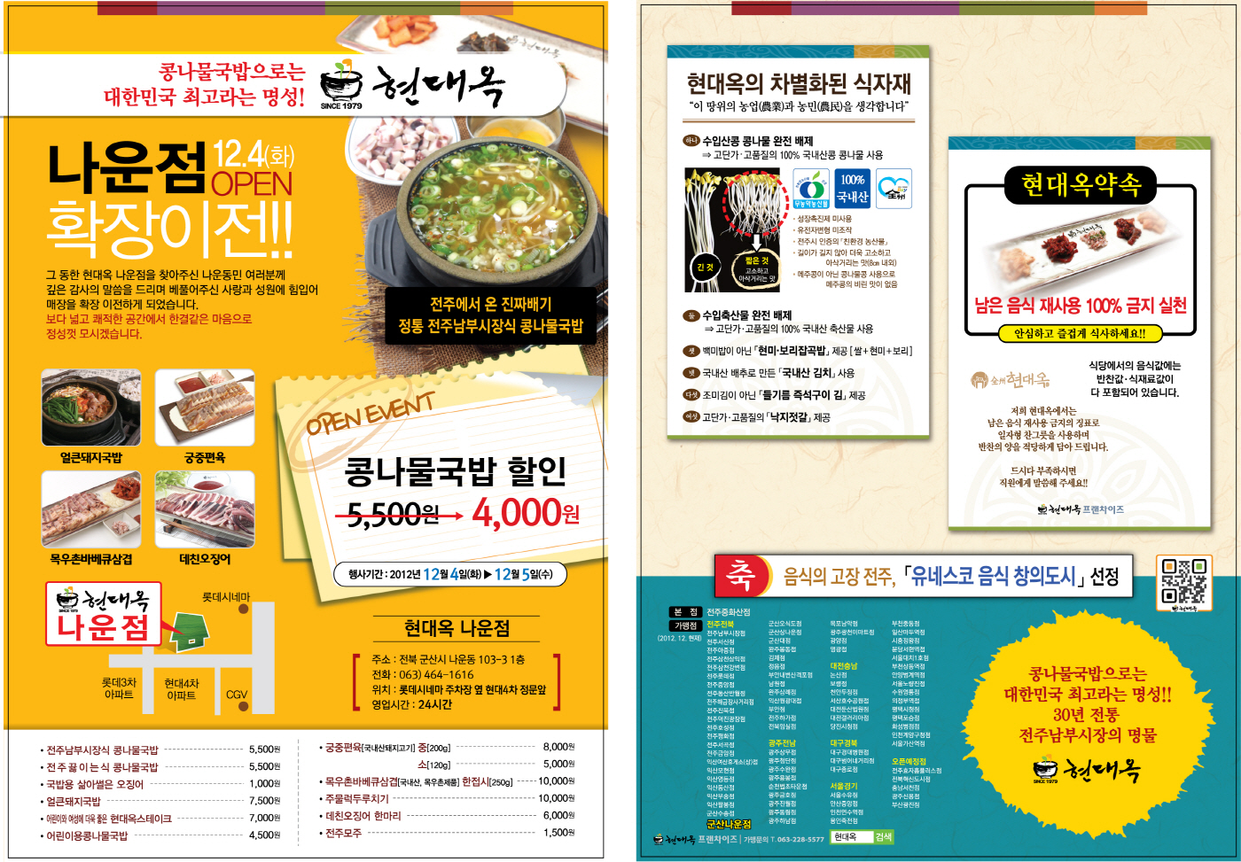 군산 소재 나운점이 오늘자로 이전하여 오픈하였습니다. 당초의 나운점은 군산 나운동의 강천상가내에 위치해 있었는데 최악 수준의 입지 여건때문에 영업력이 현대옥가맹점중 최하위 수준이었습니다. 참고로 같은 브랜드,같은 맛,같은 군산 지역,같은 메뉴였는데도 입지여건에 따라 매출차이가 극명하게 달리 했던 케이스입니다. 새롭게 확장 이전한 나운점도 군산의 여타 가맹점처럼 크게 성공하시기를 빕니다. 사장님!! 인테리어하시고 오픈 준비하시느라 고생 많으셨습니다. 현대옥 가족이 되심을 크게 환영하는 바이며 보여 주신 순한 마음으로 영업을 하시면 복이 저절로 올 것입니다!!! 대박나세요!!! 주소:전북 군산시 나운동 103-3 전화:063-464-1616 위치:군산롯데시네마 주차장 옆,현대4차 정문 앞 영업시간:24시간 ## 나운점 오픈전단지(앞/뒷면 , 클릭하면 확대)