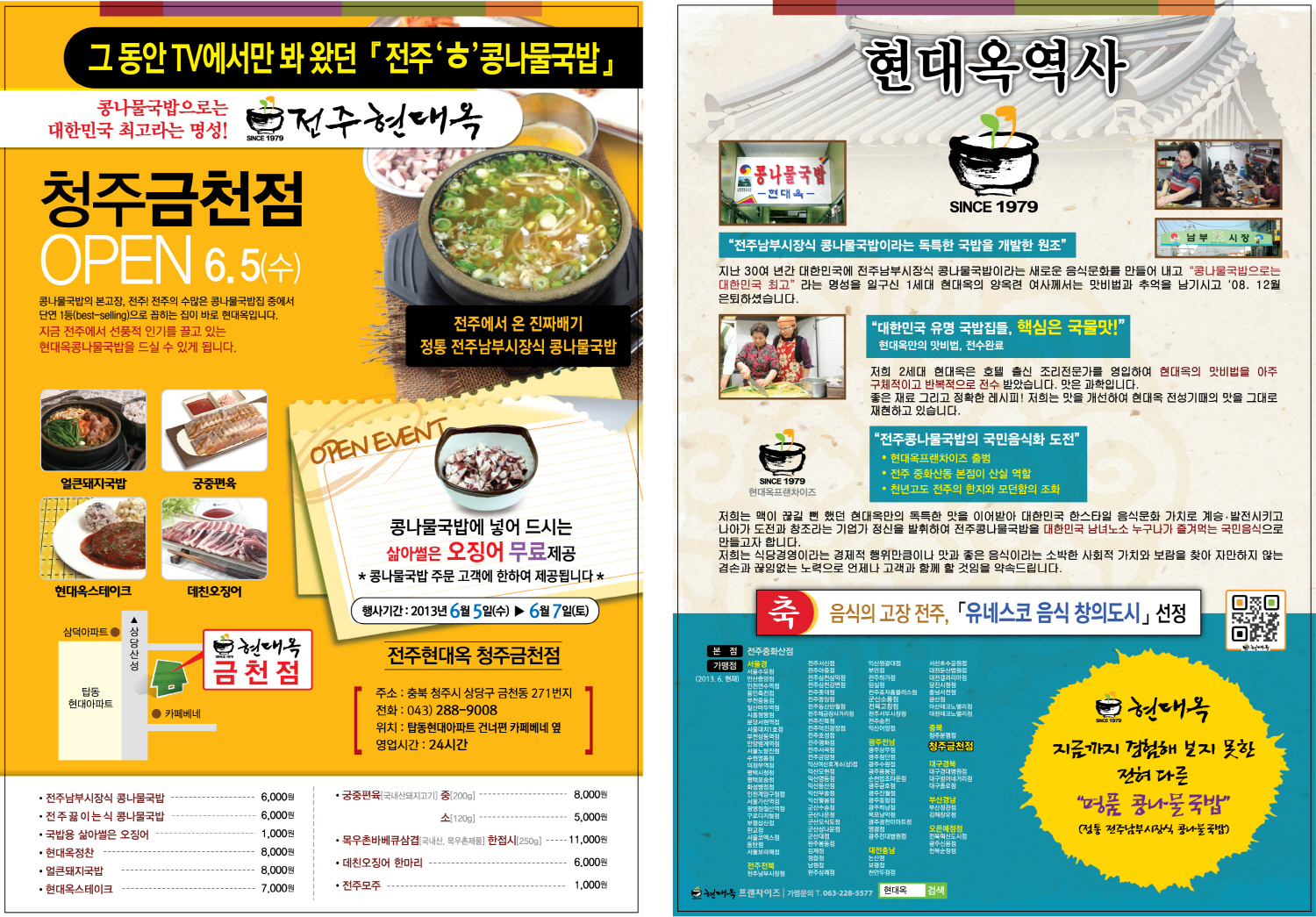 오늘자로 청주 상당구에 위치한 청주 금천점이 오픈하였습니다. 오픈 첫날인 오늘 많은 고객들로 붐빌정도로 성업을 이루었다고 합니다. 인근 대단위 아파트단지가 밀집되어 가족 외식이 많을것으로 앞으로의 큰 영업력이 기대가 됩니다. 청주첨 사장님!!! 오픈준비 하시느라 고생 많으셨습니다!! 꼭 대박나세요~!! 금천점의 큰 성공을 위해 저희 본사에서도 최선의 노력을 다하겠음을 약속드립니다. 주소 : 충북 청주시 상당구 금천동 271번지 전화 : 043-288-9008 위치 : 탑동현대아파트 건너편 카페베네 옆 영업시간 : 24시간 ## 오픈전단지 보기 (앞/뒷면, 클릭하면 확대)