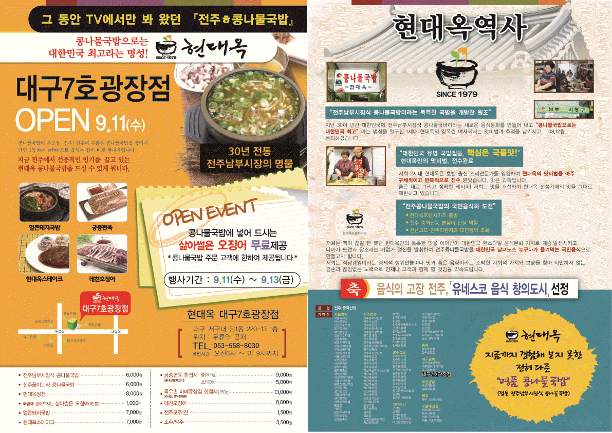 오늘자로 대구에서 최고의 핵심 상권중의 한곳인 서구 내당동에 대구7호광장점이 성황리에 오픈하였습니다. 오픈 첫날인 오늘 많은 손님들이 찾아주셨고 반응또한 아주 좋아 앞으로의 더 큰 영업력이 기대가 됩니다. 특히 대구에서는 이미 몇군데의 현대옥들이 성업을 이루고 있으며 금일 핵심 상권에 7호광장점이 오픈을 하여 대구 지역의 현대옥 인지도 저변확대와 동반상승 효과를 기대 해봅니다. 사장님! 그간 인테리어, 오픈준비등에 수고 정말 많으셨습니다. 큰 성공 이루시길 바라며 저희 본사에서도 최선의 노력을 다 할것임을 약속드립니다!! 주소 : 대구 서구 내당1동 220-13 1층 위치 : 두류역 근처 전화 : 053-558-8030