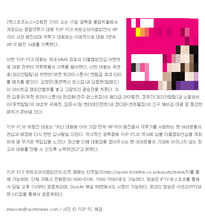 이번 주 토요일(8월 15일) 서울올림픽공원내 올림픽홀에서 개최되는 격투기 TOP FC8 대회에 저희
