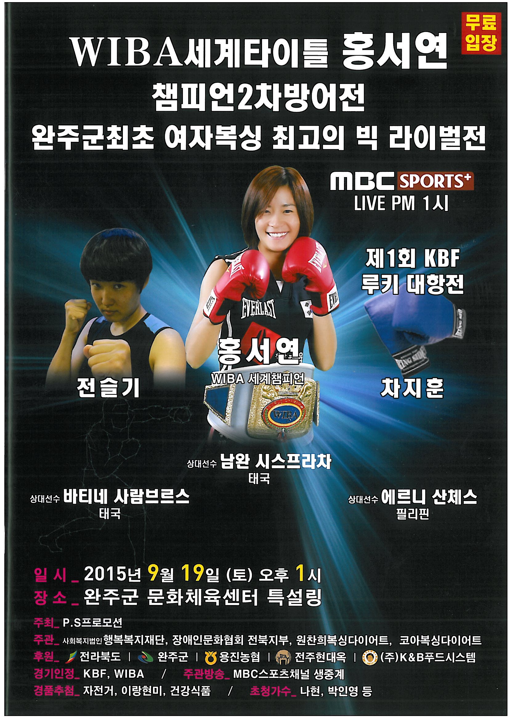오늘 919() 13:00 전북완주에서 개최되는 WIBA세계타이틀 참피언 홍서연 선수의 2차방어전 권투대회에