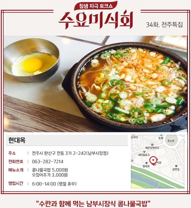 인기 미식 프로그램인 tvN<수요미식회> 34회차 "전주편"에 저희 전주남부시장현대옥콩나물국밥이 소개되었습니