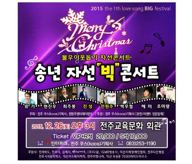 12월 26일(토) 15:00 전라북도교육문화회관에서 개최되는 "2015 진성, 전원주 자선 빅콘서트"에