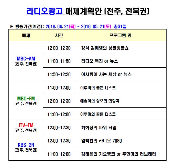 모레 4월21일부터 한 달 간 전북지역 라디오를 통하여 현대옥 광고를 실시합니다. 금번 라디오 광고는
