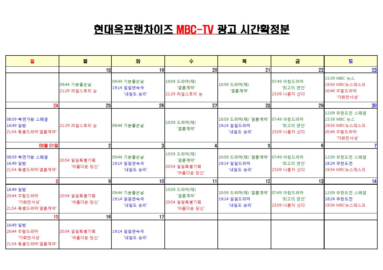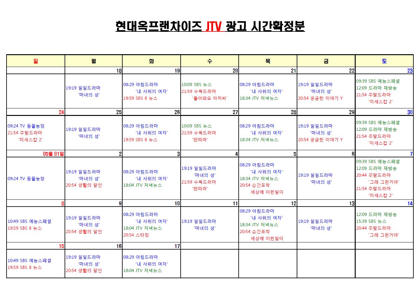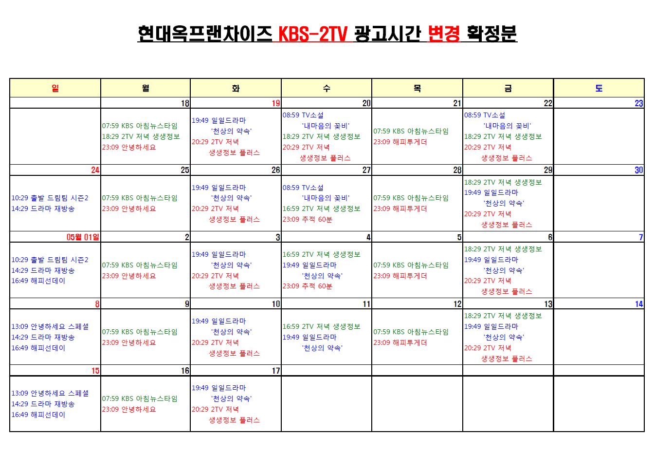 ## KBS2TV 방송개편에 따라 현대옥광고 시간도 일부 변경이 있어 아래 광고시간표 중 kbs2TV 부분은