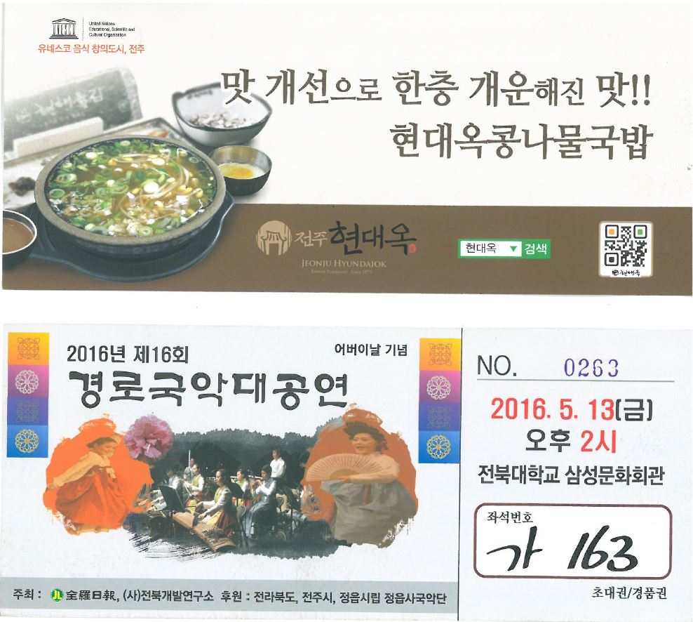 경로국악대공연에 저희 현대옥이 작년에 이어 금년에도 협찬 참여합니다. 공연티켓 뒷면 전체에