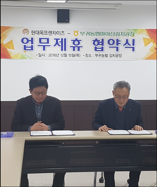 <협약식 사진: 왼쪽 현대옥 대표, 오른쪽 부귀농협 정종옥 조합장>