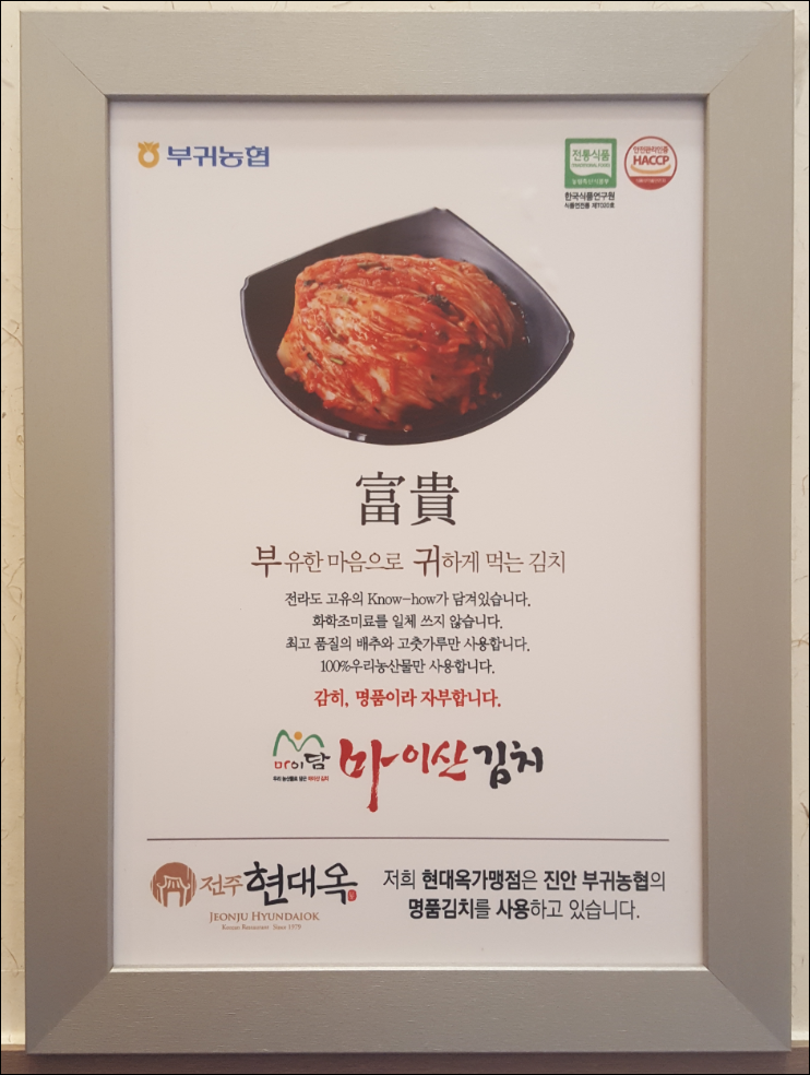 저희 현대옥가맹점 중 마이산김치를 반찬용으로 사용하는 가맹점에는 부귀농협에서 제공하는 인증패를