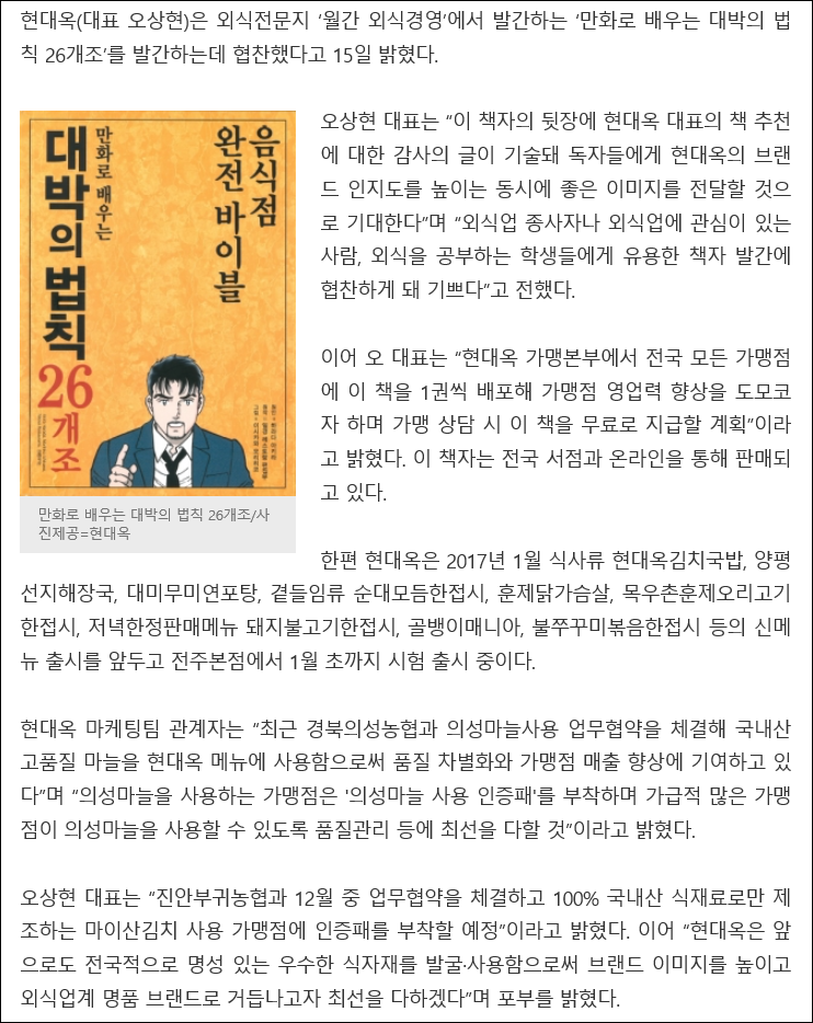 내년 1월부터 부착하게 되는데, 이로써 해당 현대옥가맹점을 찾는 고객들께는 또 한번 현대옥의 브랜드
