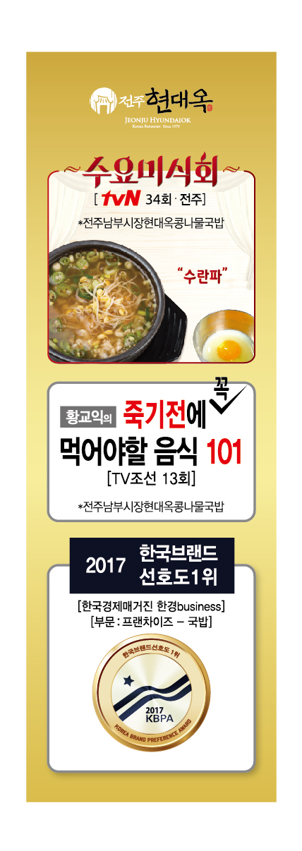저희 현대옥의 원조 식당인 전주남부시장 현대옥의 콩나물국밥이 2015년 9월에 tvN "수요미식회 34회 전주편" 에 소개되었었고, 2016년 4월에는 TV조선 '황교익의 죽기전에 먹어야할 음식 101'에 소개되었었습니다. 최근에는 저희 현대옥이 한국경제신문의 주간 경제전문지인 한국경제매거진 한경business가 주최하는 '2017한국브랜드선호도1위' 선발에서 '프랜차이즈-국밥' 부문에 선정되었고 다음 달 2월 시상식을 앞 두 고 있습니다. 이러한 현대옥의 자랑거리들을 배너로 만들어 이번 주말부터 전국 현대옥가맹점의 출입현관문에 비치하게 됩니다. 이로써 현대옥가맹점 인근의 고객들께 현대옥의 위상을 널리 알려냄으로써 현대옥브랜드 가치를 올리고 가맹점의 영업력 향상에도 도움될 것으로 기대합니다. 배너디자인을 아래에 첨부합니다. <배너 디자인>