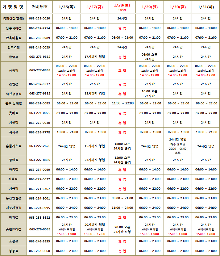 다음글 전주해금장사거리점, 전주역점으로 가맹점명 변경 2017-01-20