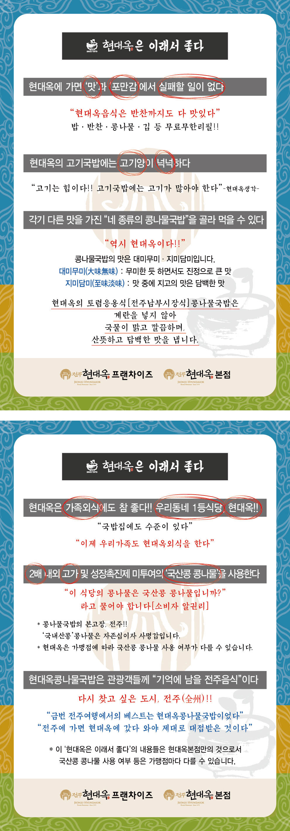 '현대옥전주본점 메뉴북'에 대하여 전국가맹점들에 배포함, 본점식당에 적극적으로 비치함 그리고 현대옥홈페이지에서도 적극 표현함 등이 그러하지 아니함들보다는 우리 현대옥가맹사업체 구성원 모두에게는 물론 소비자 고객들께도 이익이다라고 판단합니다.