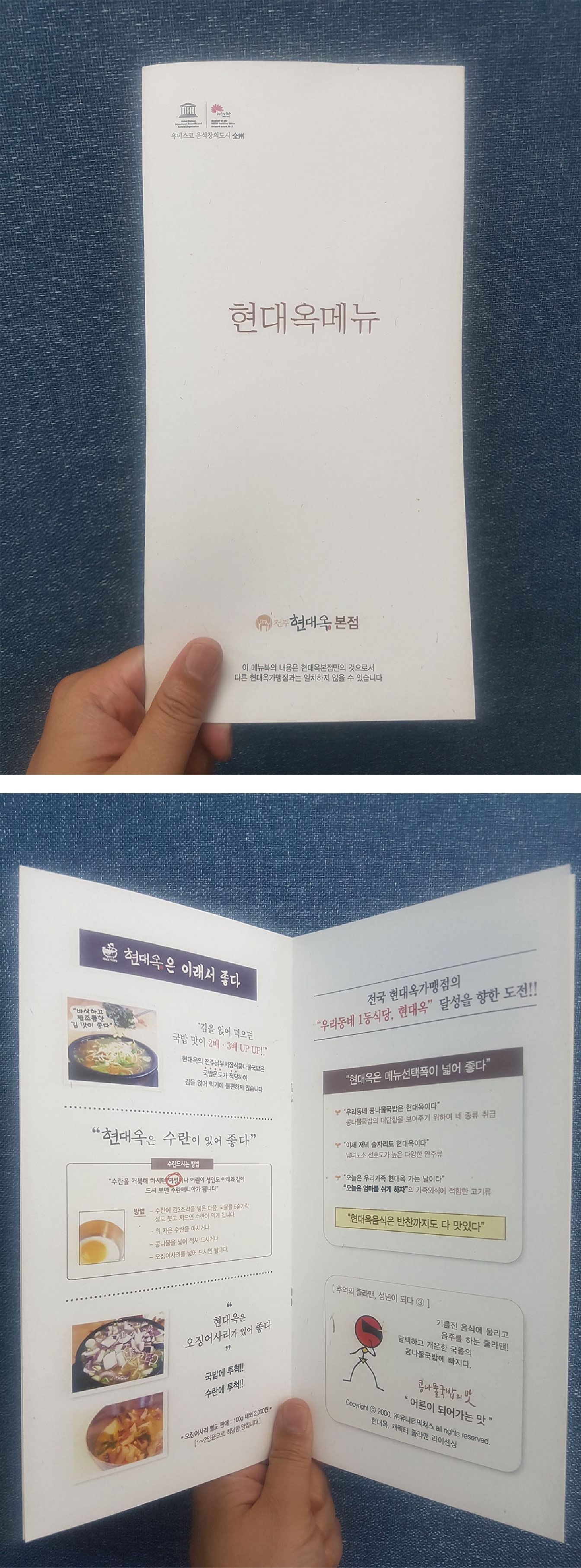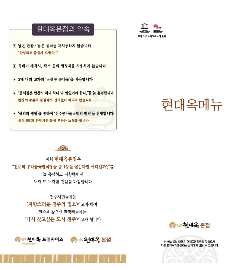 저희 현대옥본사는 위와 같은 경영적 인식을 실천하는 방편 중 하나로서, 비록 작은 것이기는 하지만 고객용 메뉴북에 상당한 힘을 쏟아 왔습니다. 저희 현대옥본사는 현재 기준의 현대옥의 것들 그리고 앞으로의 방향성 등을 그 간 '본점메뉴북'에 담아 왔으며, 본점메뉴북이 갱신될 때마다 전국 가맹점들에 본점메뉴북을 우편발송하여 오면서 '깃발' 역할을 하고자 하였으며, 또한 본점식당의 각 테이블마다에는 2권씩 비치하여 본점을 찾는 전국으로부터의 고객들께 현대옥을 '안내'드리고자 해왔습니다.
