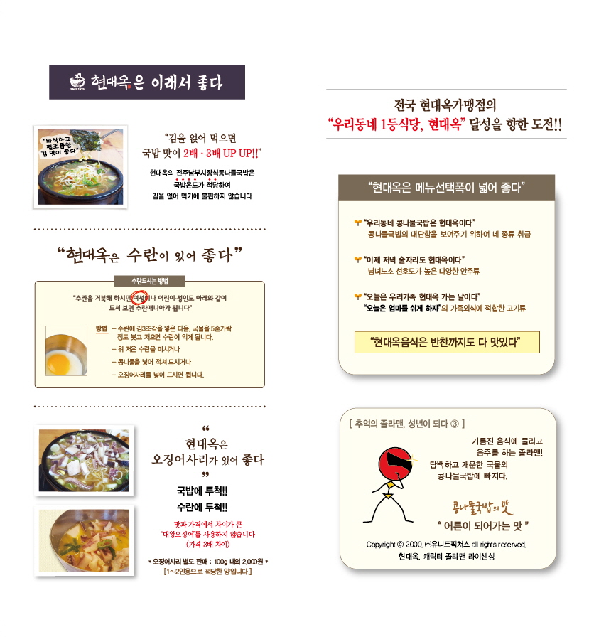 저희 현대옥은 이렇게 어려운 강제성이나 일률성 부분은 어느 정도 우회하면서 각 가맹점주가 갖는 경영적 인식과 판단을 일정 존중하고자하면서 취급메뉴의 선택이나 메뉴가격 책정을 점주 선택에 맡기고 있습니다. 이러다보니 메뉴의 종류와 메뉴가격에 대한 현대옥 전체적인 동질성은 상당 부분 미흡하기만 합니다. 이 부분은 시간이 흘러가면서 본사의 지속적인 노력, 고객의 요구 그리고 공동체 의식의 점증에 따라 자연스럽게 동일화되리라고 봅니다.
