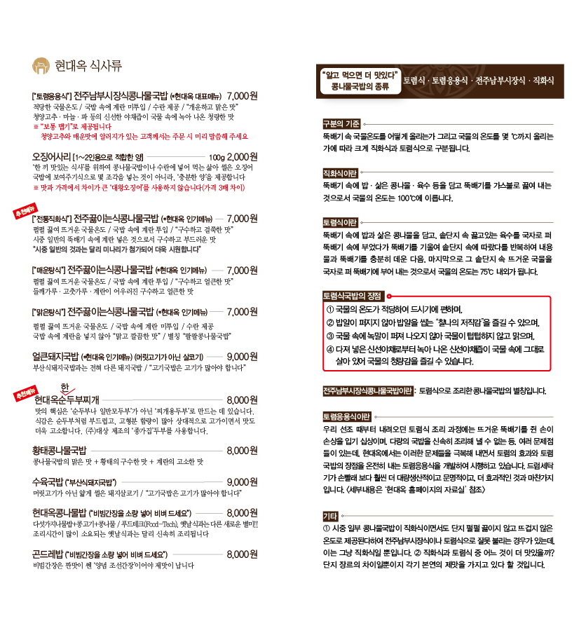 그 간 본점메뉴북을 통하여 달성하려고 했던 '깃발'과 '안내'의 역할을 좀 더 넓혀서 펼치고자 하면서 이제부터는 전주본점메뉴북을 현대옥홈페이지의 '상시 공지'에 배치해 놓고자 합니다.