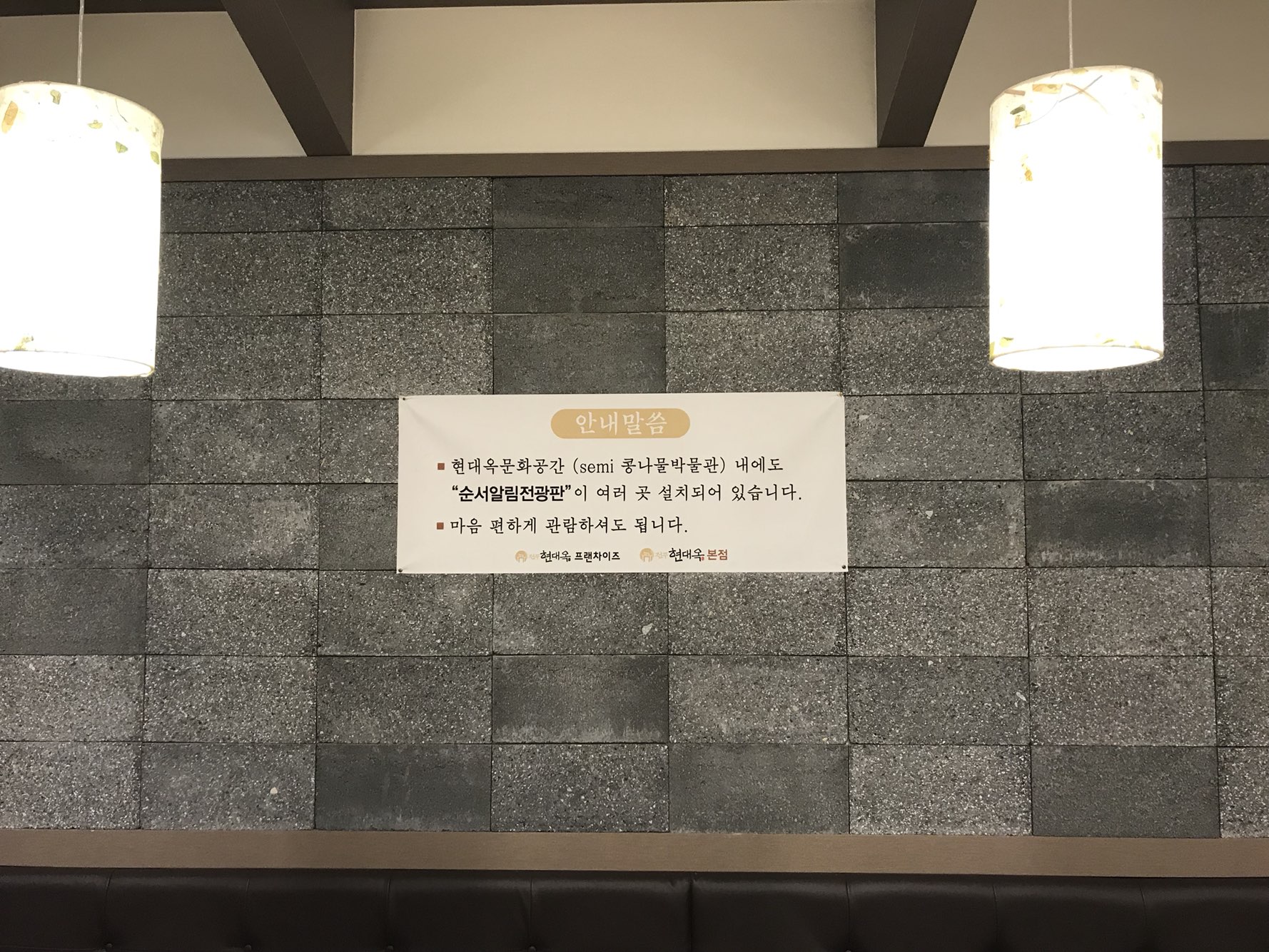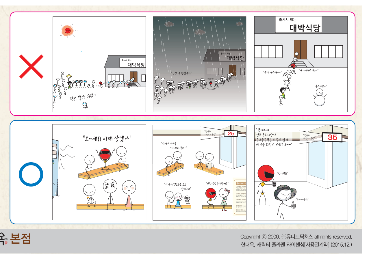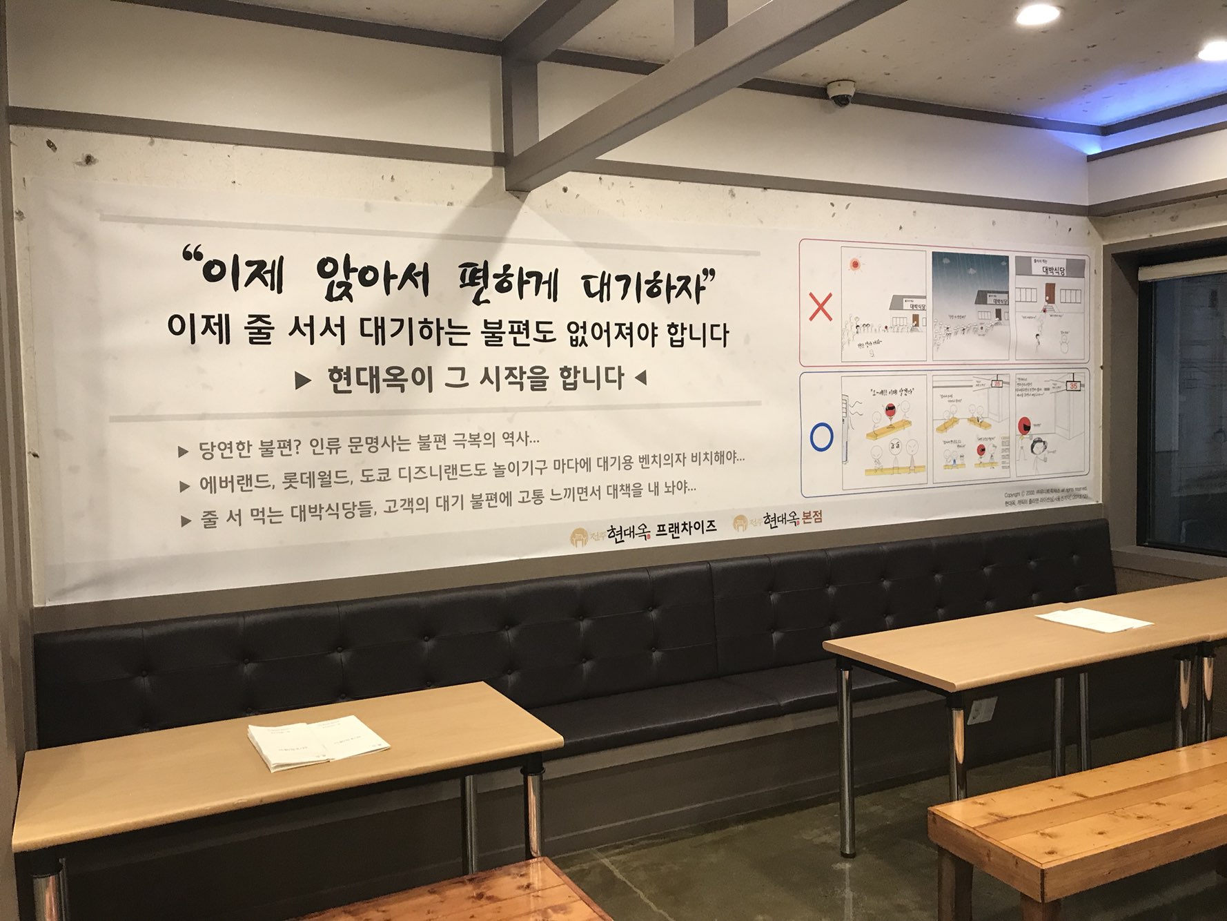 저희 현대옥가맹본부에서는 "이제 도쿄디즈니랜드도 각 놀이기구 마다에 대기용 벤치를 비치하여야 한다'라고 주장하면서 그 시작을 현대옥이 한다라고 표방하기도 하였습니다.  저희 현대옥홈페이지의 자료실 내 현대옥에서드리는글 게시판에서는 얼마 전 '대기 문제'에 대한 새로운 관점을 글 쓰기도 하였었는데, 그 글의 취지에 기반한 실천으로대기공간을 신장오픈한 것이기도 합니다.