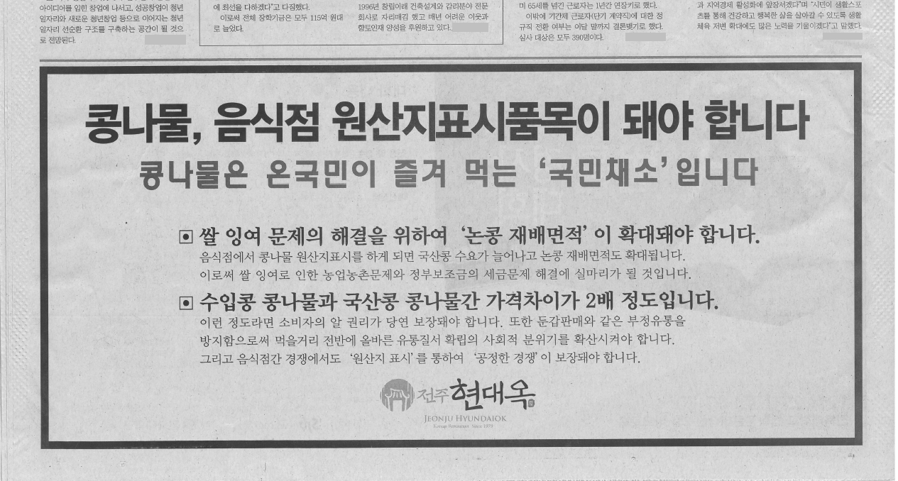 저희 현대옥홈페이지 '현대옥에서 드리는 글'의 게시판에서는 지난 12월 13일자 '공정한 경쟁(1)'이라는 제목의 글을 통하여 이제 음식점에서 콩나물 원산지 표시를 하여야 한다라고 주장한 바 있습니다. 이 주장을 좀 더 확산시켜 국민적 공감대를 형성하고 조속히 정책으로 반영시키고자 하면서 오늘부전북지역 지방신문들을 통하여 5단통광고를 실시하고자 합니다. 오늘은 우선 새전북신문 2면에 게제됐고 내일부터는 전북일보와 전북도민일보 등에 각각 수 회 광고 게제될 것입니다. 현대옥 고객 여러분께서도 금번 현대옥이 주장하는 '음식점에서의 콩나물 원산지 표시'에 관심을 적극 갖으시면서 성공할 수 있도록 성원과 참여를 함께 하여 주시기 바랍니다. 음식점에서의 콩나물 원산지 표시에 공감하시는 분들께서는 동 건을 청와대국민신문고 국회 농림축산식품부 등에 국민청원하셔야 할 것입니다. 저희 현대옥가맹본부에서도 동 건에 대하여 정책 청원할 계획입니다. 아래에 오늘자 새전북신문에 게제된 광고를 첨부하여 놓습니다.