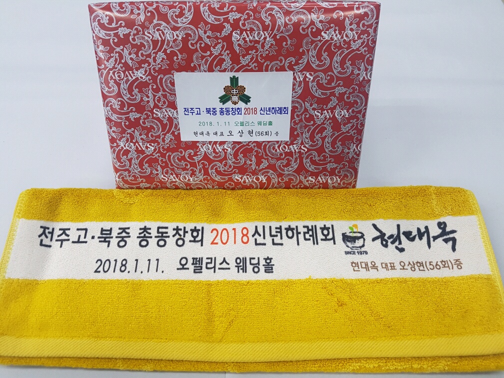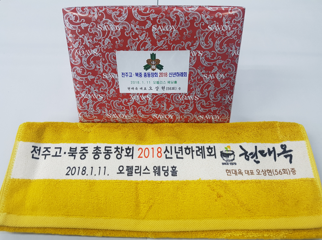 지난 주 1월 11일 전주오펠리스웨딩홀에서 개최된 전주고북중총동창회 2018 신년하례회의 참석자들께 현대옥대표가 작년에 이어 금년에도 기념타올을 증정하였습니다. 전국 각지 전주고북중 동문의 가정집에는 현대옥타올이 다수 있을 것인데, 이로써 현대옥이 전주고 동문의 가족과 친지들에게까지 우호적으로 자리매김 되기를 기대합니다.