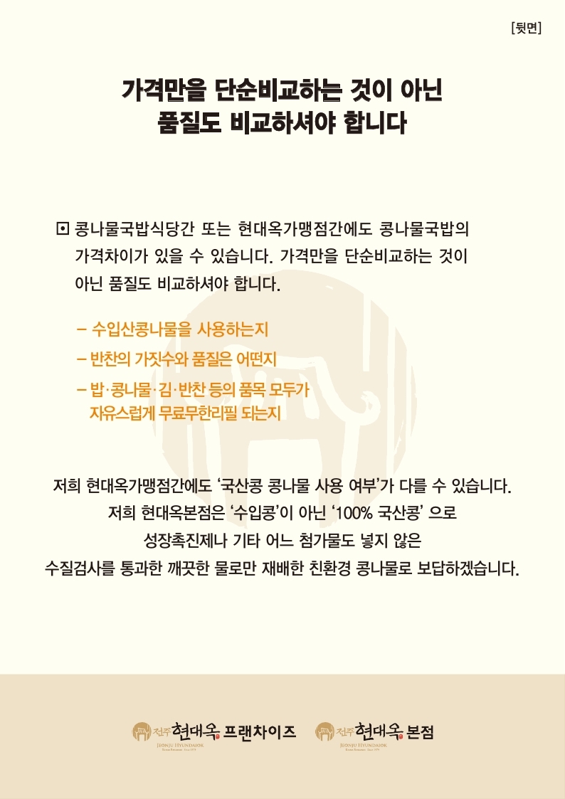 TV에 몇 십년 째 1,500원짜리 국밥, 2,000원 짜리 짜장면 등이 훈훈하게 소개되기도 하는데, 이러한 희귀의 경우를 일반화해서 말하여서는 안될 것입니다. 그리고 주변을 보면 3,900원짜리 콩나물국밥식당들이 있는데, 그러한 식당들이 20181월 현재의 가격이 어떤지, 언제 가격을 인상할 것인지 여부 그리고 지금 잘 번창하고 있는지 등은 잘 모르겠습니다. 분명한 것은 가격만을 단순비교하여서는 안된다는 것입니다. 콩나물이 수입산인지 국내산인지, 콩나물에 성장촉진제를 넣어 인위적으로 발육시킨 것인지, 반찬에 오징어젓갈이 아닌 낙지젓갈이 있는지, 반찬으로 김치깍두기와 새우젓만을 주는지, 밥 콩나물 반찬 김 등을 자유로이 무료리필 이용 가능한지 등의 품질을 따져야 합니다. 사실 이러한 반찬품질의 차이는 현대옥가맹점 내부에서도 발생하고 있는 것이기도 한데, 이로써 각자의 품질에 맞추어 각자의 가격을 책정하고 있기도 합니다. 식당은 품질과 가격을 숨겨 놓고 장사할 수 없는 것인데, 눈에 보이는 품질 차이는 애써 외면하고 덮어놓고, 가격만을 따지는 것은 이기적 소비행태이자 평소 막무가내 억지입니다.