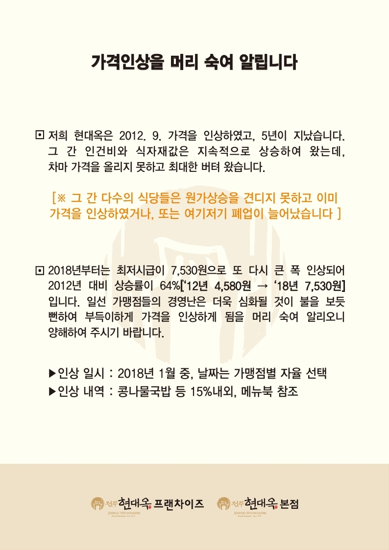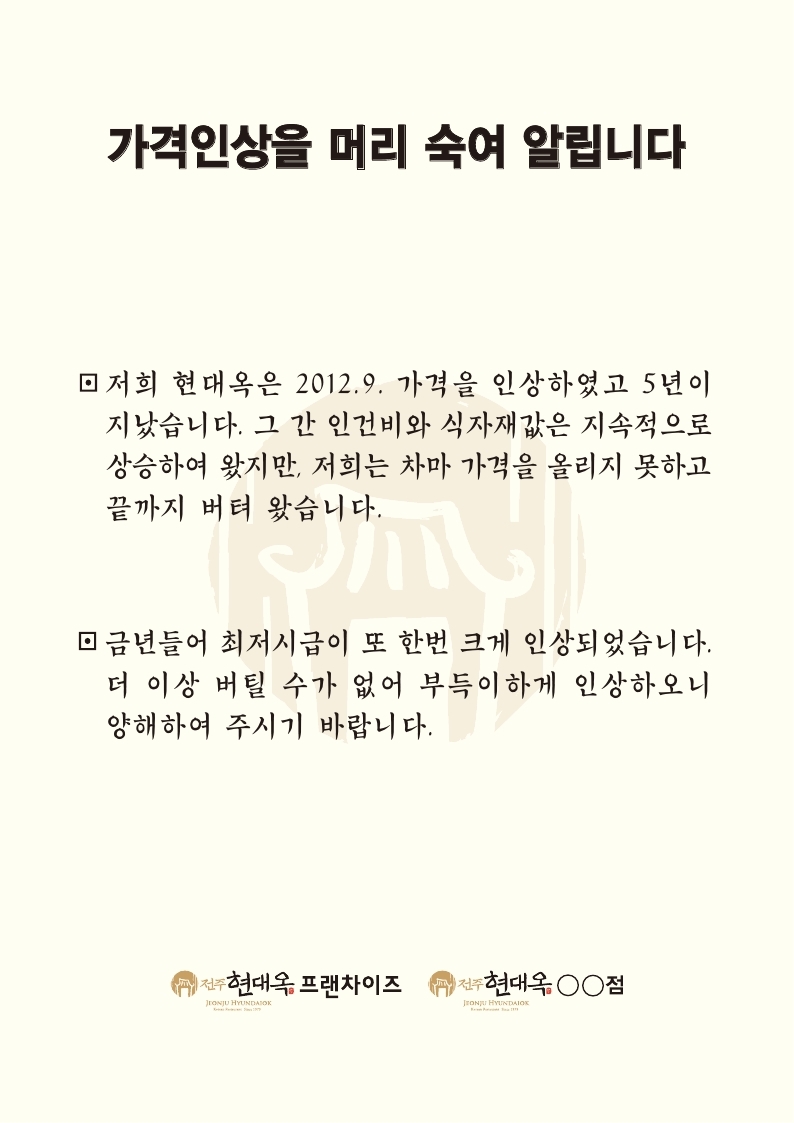 * 금번 가격인상과 관련하여 현대옥본점 및 가맹점들에서 매장에 게시할 가격인상 안내문을 아래에 첨부합니다. 안내문은 두 종류 버전으로서 하나는 메뉴북마다에 삽지해 놓는 A4용지의 양면인쇄본이고, 다른 하나는 매장내외에 부착 비치할 현수막버전입니다. 가맹점별로 자율선택하도록 하였습니다. 현대옥본점은 두 종류 모두를 상당 기일 동안 게시할 것임도 말씀드립니다.