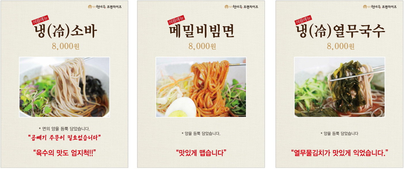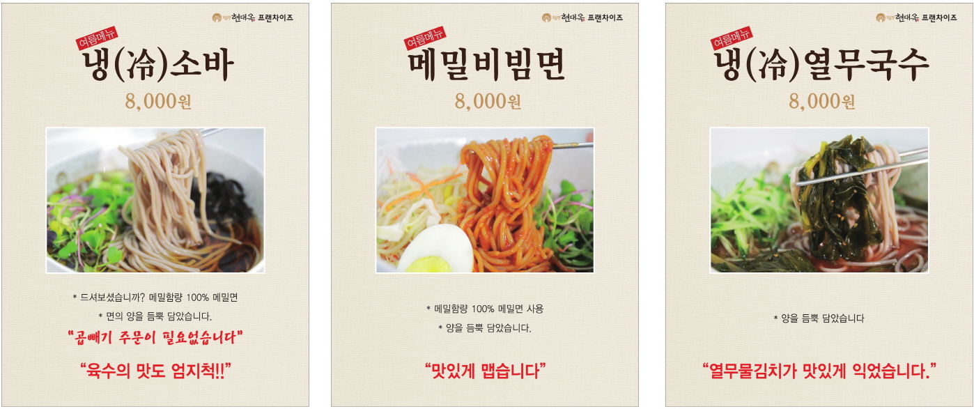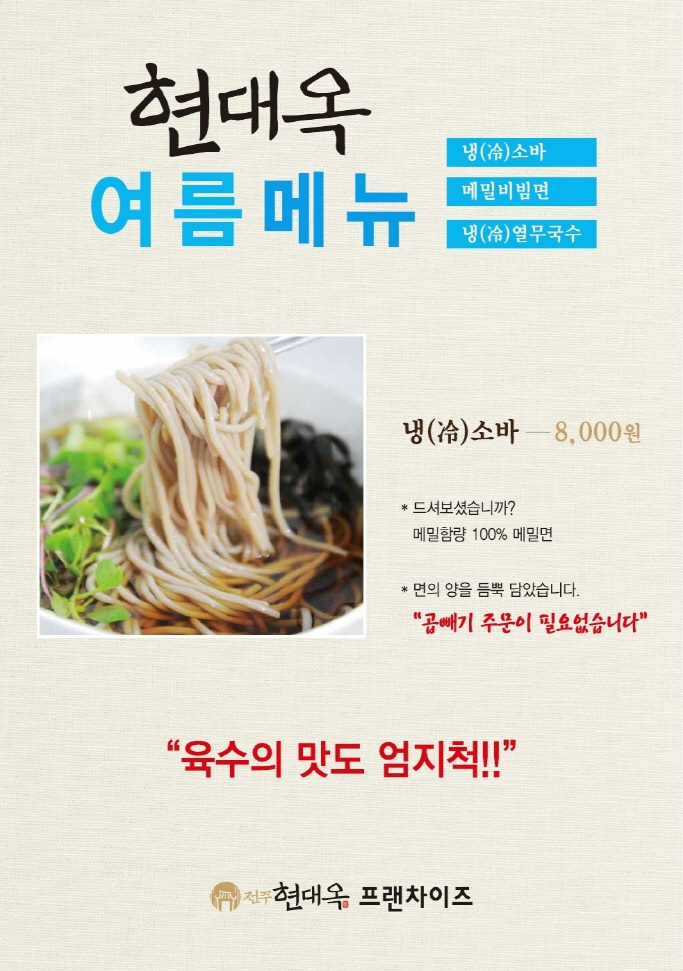 아래에 메밀함량 100%의 메밀면 사용의 경우와 그렇지 않은 경우의 두 가지에 대한 실내외 부착의 메뉴사진 POP와 현수막 이미지 등을 첨부하여 놓으니, 현대옥의 여름 메뉴를 많이 사랑해 주시기를 바랍니다.