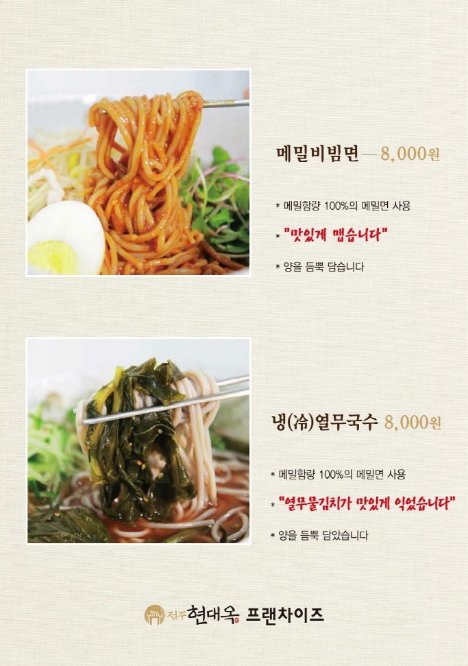 여름메뉴는 냉소바 비빔메밀면 냉열무국수의 세 종류로서 가맹점에서는 취급 여부와 취급 품목을 자율 선택하게 됩니다. 또한 가맹점에서는 메밀함량 100%의 메밀면과 그렇지 않은 메밀면 중에서 자율적으로 선택하도록 하였습니다. 전주본점은 고급 브랜드이면서 월등히 고가인 '효자원'의 '메밀 100%함량의 메밀면을 취급하게 됩니다.