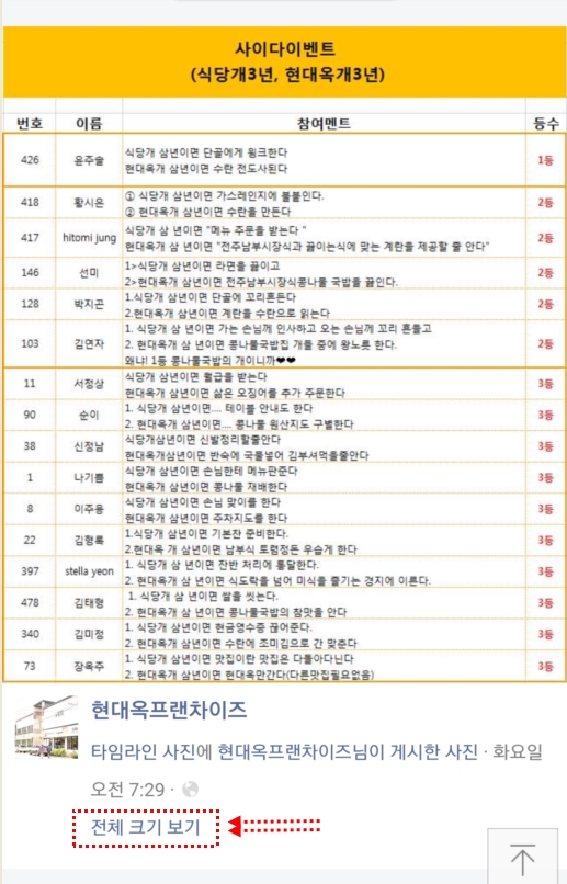 10/3~10/20간 실시한 현대옥페이스북 '댓글달기'이벤트의 당첨작 및 당첨자 내역을 10월 23일자 페이스북 현대옥프랜차이즈계정에 발표하였습니다. 페이스북을 사용하지 않는 고객들을 위하여 이곳 홈페이지에도 당첨작 및 당첨자 내역을 발표합니다. 내역은 아래 링크를 접속하여 확인하실 수 있습니다. https://www.facebook.com/193767363985733/posts/2274116249284157/ ※ 모바일로 위의 링크를 접속하여 확인할 때 당첨작 및 당첨자 이미지 클릭 후 하단의 '전체 크기 보기'를 클릭하게 되면 확대하여 볼 수 있습니다.