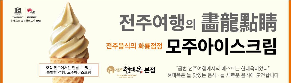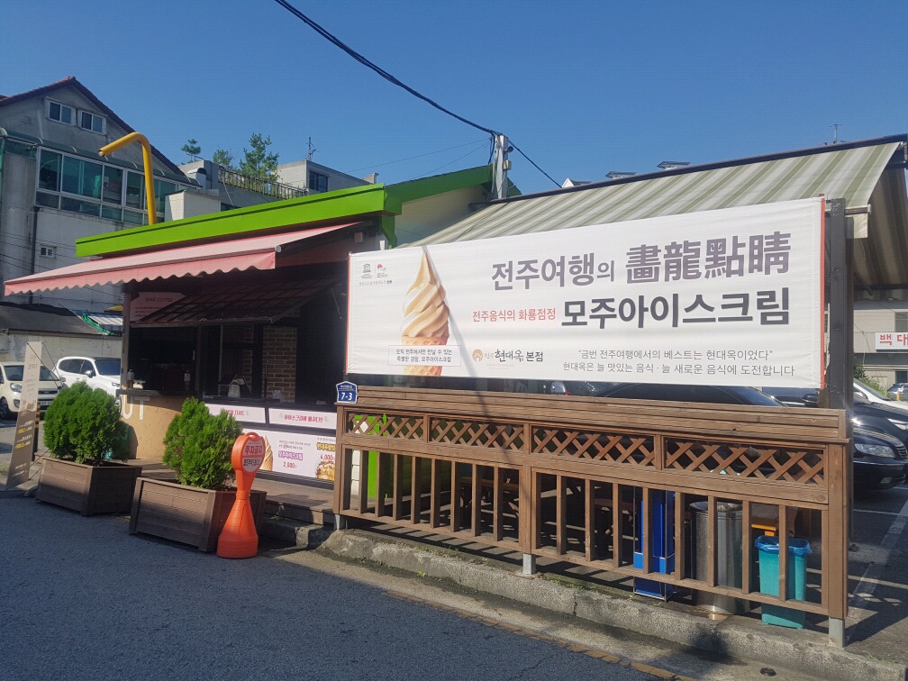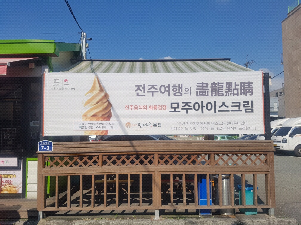 현대옥본점 앞 현대옥카페에서 판매하고 있는 모주아이스크림에 대한 마케팅을 강화하고자 하면서 "전주 여행의 화룡점정, 모주아이스크림"의 새로운 현수막을 현대옥카페 옥외에 부착하였습니다. 전주를 방문하시는 여행객들께서는 현대옥본점에 오시면 '전주음식' 두 가지를 경험하실 수 있는데, 하나는 전주콩나물국밥이고 다른 하나는 오직 전주에서만 경험할 수 있는 '모주아이스크림'입니다.
