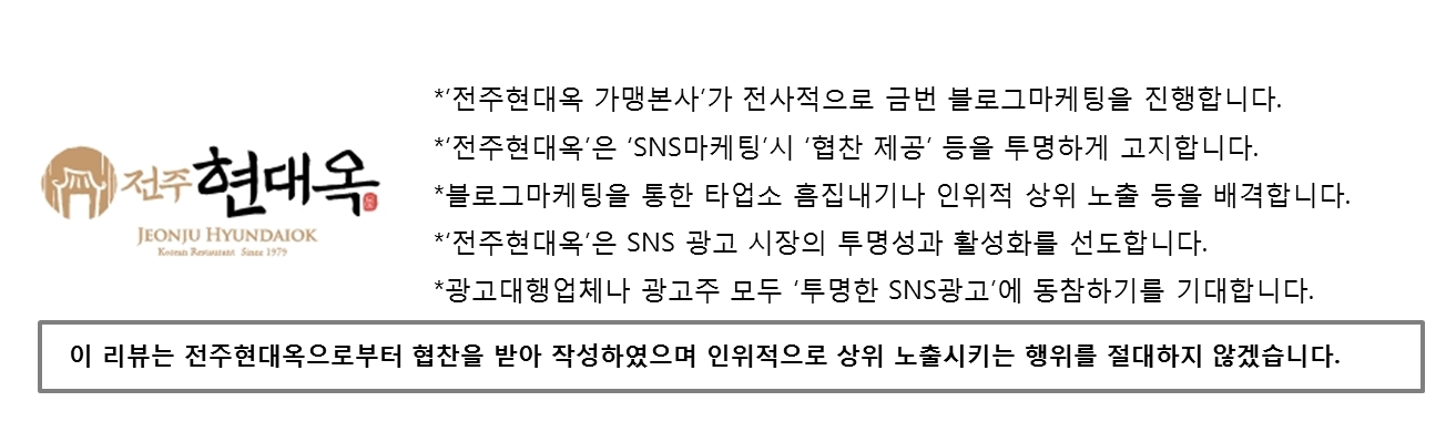 SNS광고의 투명화와 활성화를 기치로 저희 현대옥가맹본부와 SNS마케팅전문 대행사 (유)제이에프푸드가 협력하여 '클린블로거캠페인'을 펼치고 있습니다. 캠페인의 핵심 내용은 '블로그리뷰'에서 광고주로부터 협찬이나 댓가를 받은 리뷰는 '광고'라고 투명하게 고지하고, '상위노출' 역시 비정상적인 방법을 동원하는 것이 아닌 정당하게 광고비용을 지불한 것 또는 공정하고 공익적인 기준에 의한 것으로써 '투명한 영역'으로 만들자는 것입니다. TV에서 나오는 수 많은 광고를 두고 어느 누구도 비정상적이고 불공정하다고 생각하지 않는 것처럼, 바야흐로 인터넷 SNS시대에 맞도록 'SNS광고'에 대한 법규와 규범이 새롭게 나타나야 합니다.