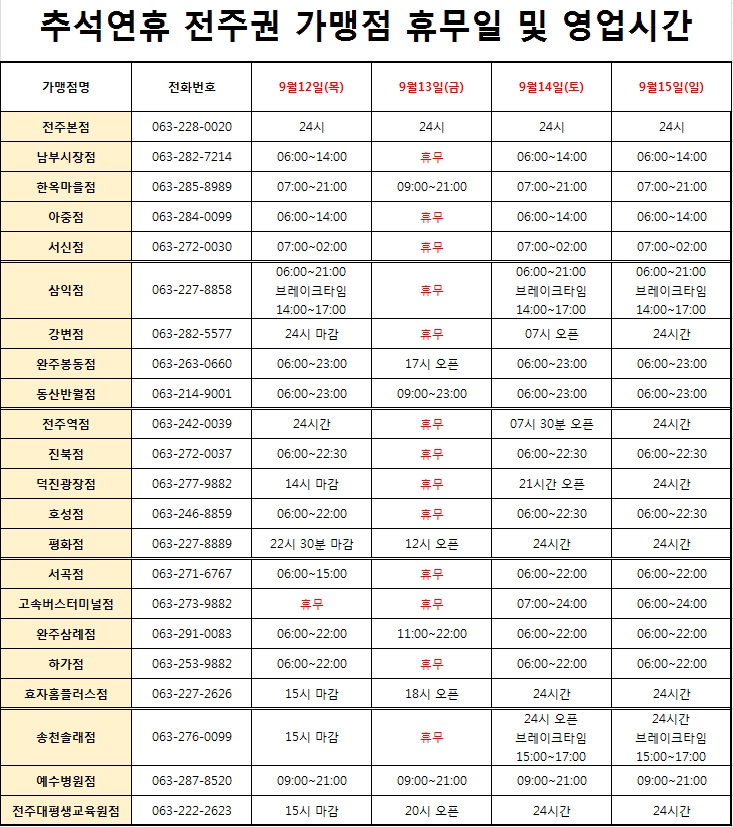 추석 연휴기간 "전주권" 현대옥가맹점의 영업시간을 아래 첨부와 같이 안내드립니다.
