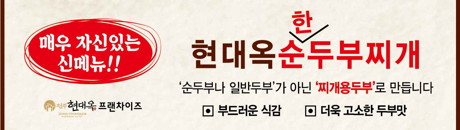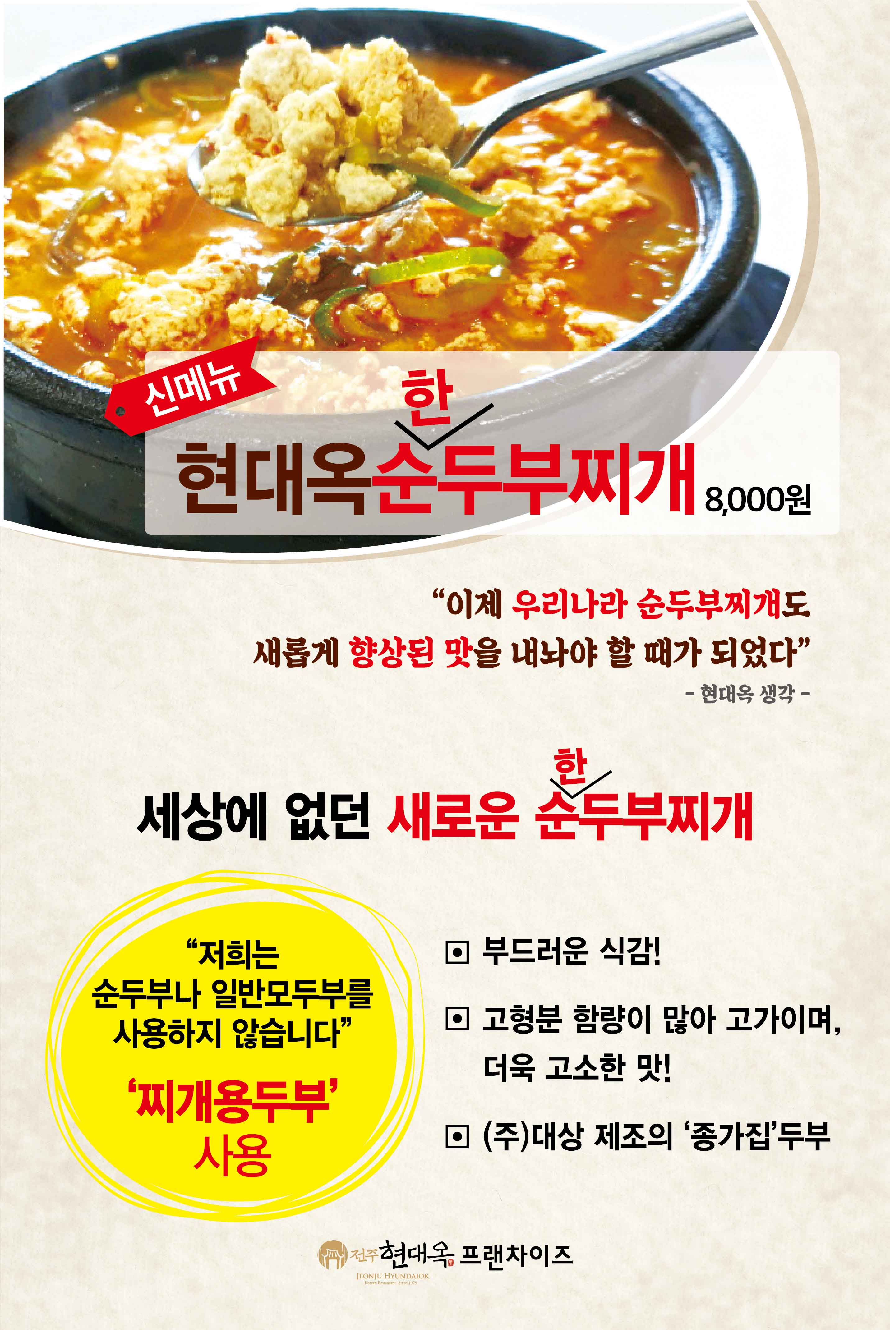 기존 메뉴들의 맛을 크게 향상시킬 수 없는 형국에서 현대옥의 생존을 담보하고 제2의 도약을 위해서는 당연 새로운 '신메뉴"가 접목돼야 합니다. 10여 년 전 현대옥가맹본부가 '얼큰돼지국밥'과 '전주끓이는식콩나물국밥'을 신메뉴로 내놨을 때 일부 비아냥이 있었지만 저희 가맹본부는 고객께 성심 껏 설득시키기도 하면서 앞만 보며 매진하였고, 지금 이 두 메뉴는 현대옥의 주력 메뉴가 되어 있습니다. 금번 '현대옥순한두부찌개'도 그런 맥락에서 '열심히 하는 현대옥의 모습'으로 이해해 주시기를 기대합니다. 저희는 "세상에 없던 맛있는 순한두부찌개"로 보답해 드리겠습니다.