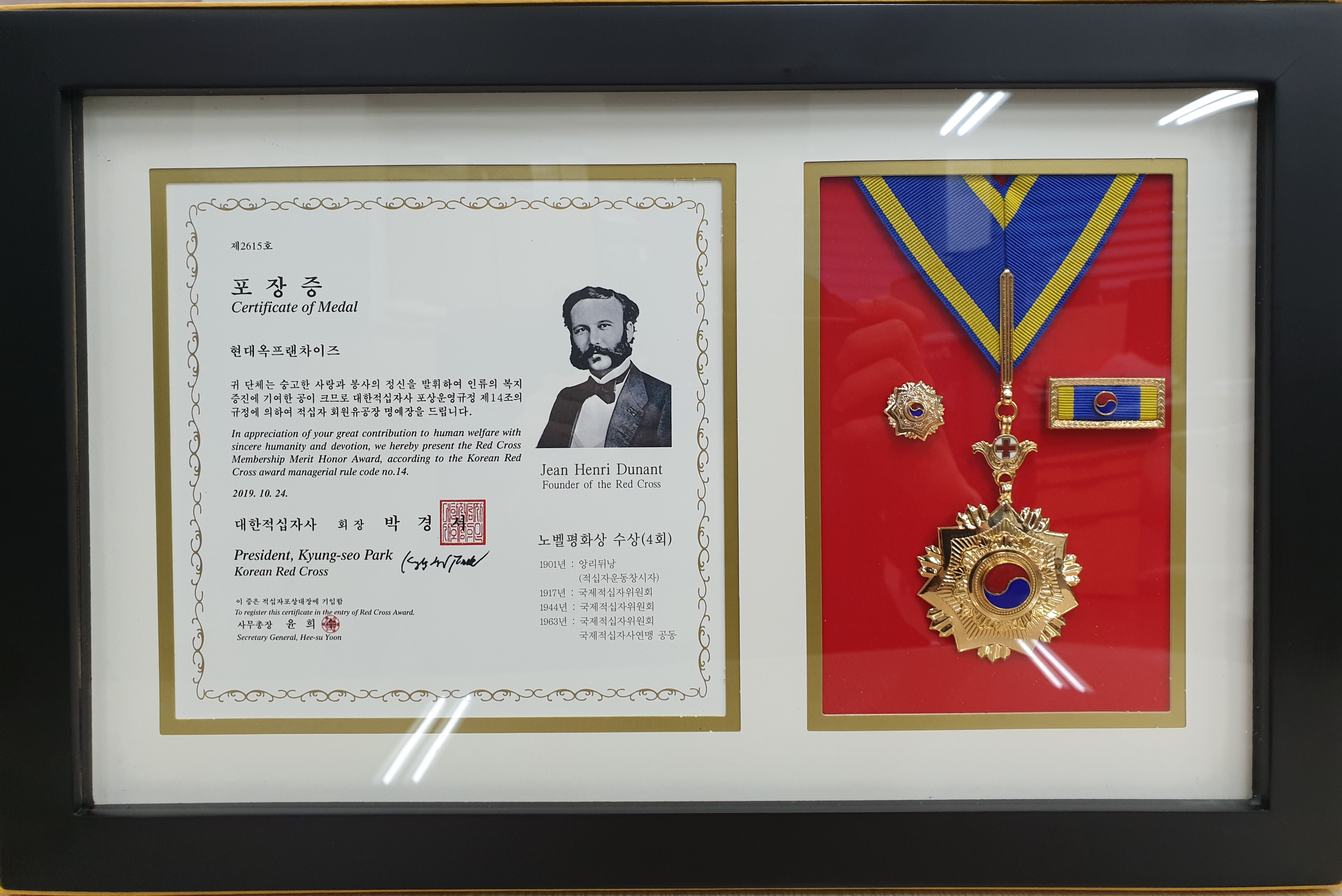 11월 11일(월) 대한적십자사 전북지사에서 개최된 대한적십자사 창립기념 행사에서 저희 현대옥이 '적십자 회원유공장 명예장' 포장을 받았습니다. 앞으로도 열심히 적십자 활동을 하라는 채찍으로 알고 성심 껏 참여할 것임을 공약합니다.