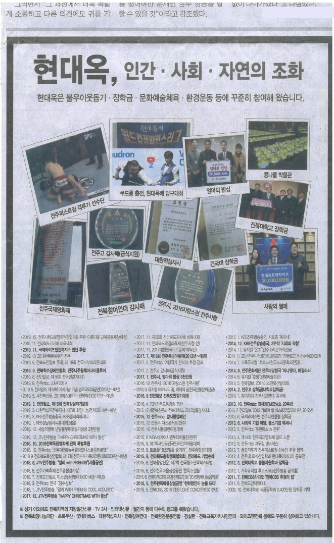 한편, 11월 12일(화)에는 현대옥의 사회공헌활동 내역을 전북도민들께 널리 알리고자 전북일보를 통하여 "현대옥, 인간 사회 자연의 조화"의 지면광고를 실시하였습니다.