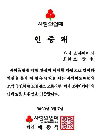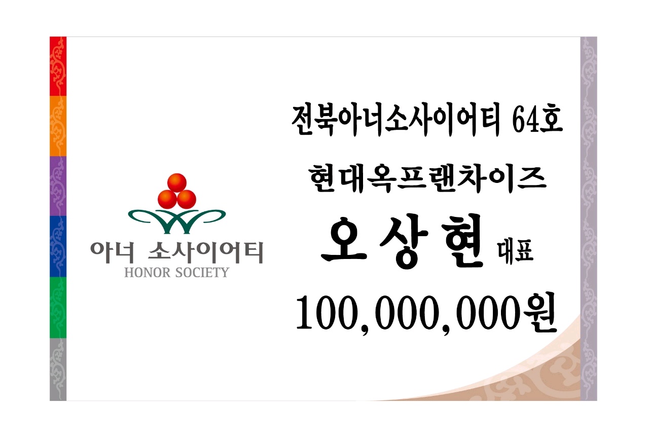 지난 2월 7일(금) 현대옥대표는 1억 이상 개인 고액기부자클럽인 '아너소사이어티'에 가입하였습니다. 가입행사는 사랑의열매 전북사무소에서 진행되었고, 관련의 뉴스가 여러 언론사에 보도되었습니다. 아너소사이어티는 사랑의열매를 통하여 1억 이상을 기부하였거나 향후 5년 내 1억 이상 기부를 약정하는 사람이 회원으로 가입합니다. 현대옥대표는 사랑의열매에 1억 이상을 기부하여 회원으로 가입하게 되었습니다. 현대옥대표는 사랑의열매에의 기부와는 별도로 장학금과 불우이웃돕기성금 등을 꾸준히 기탁해 오고 있는데, 작년 12월에는 현대옥대표의 모교 건국대학교에 2천만 원의 장학금을 기탁하기도 하였습니다. 현대옥은 앞으로도 기업의 사회공헌활동을 꾸준히 펼침으로써 노블레스 오블리제를 실천하고 전국의 현대옥고객들께 현대옥에 대한 우호적 인식을 지속적으로 심어 나가겠습니다.