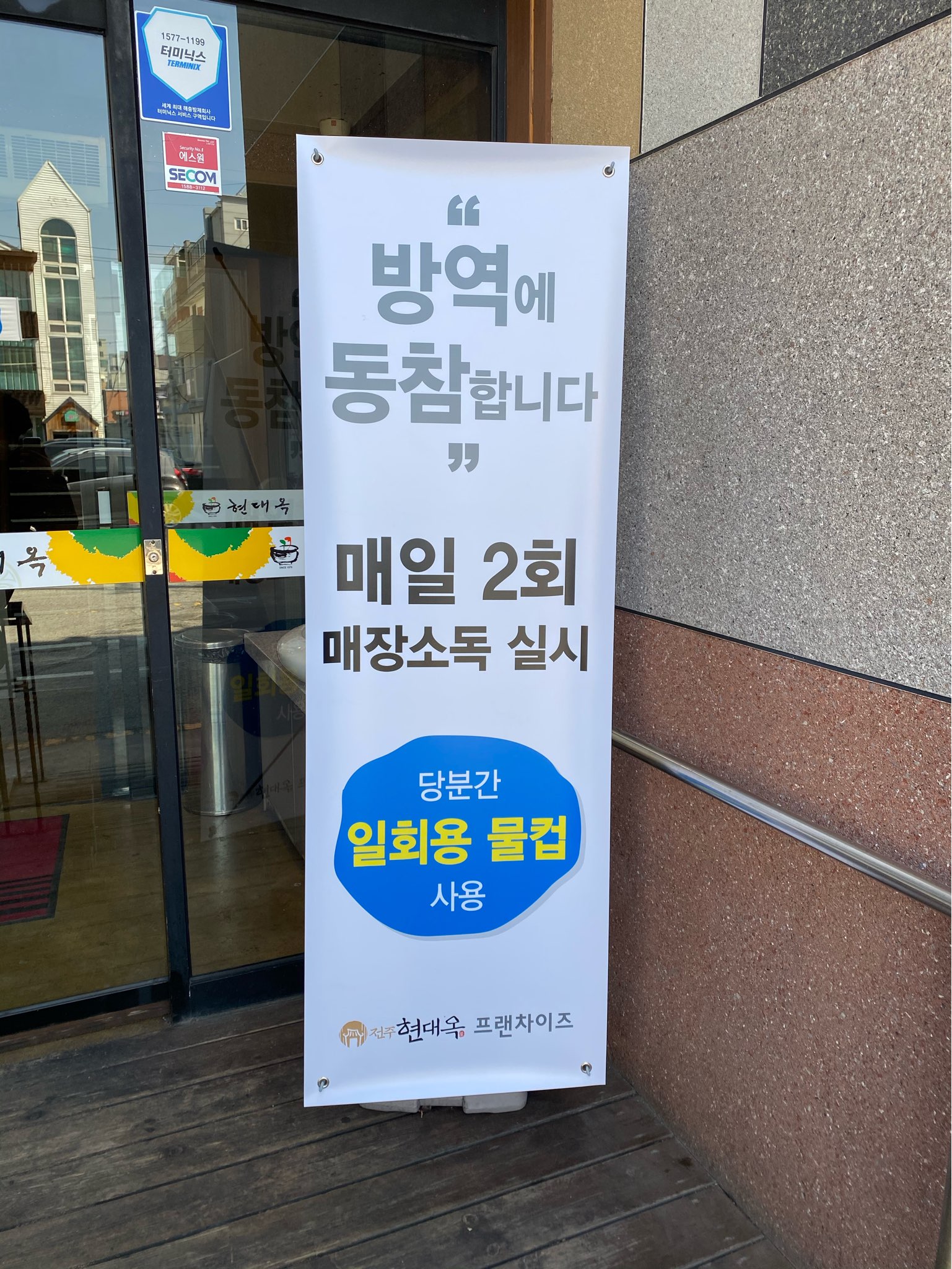 일부 업소들에서는 방역대행업체를 통해 단 1회의 방역소독을 하고 방역업체가 발급해 주는 방역실행 및 예방 업소의 스티커를 부착하고 있는데, 금번 현대옥이 펼치는 일 2회의 방역소독은 실질적인 면에서 차원이 크게 다른 것이기도 합니다.