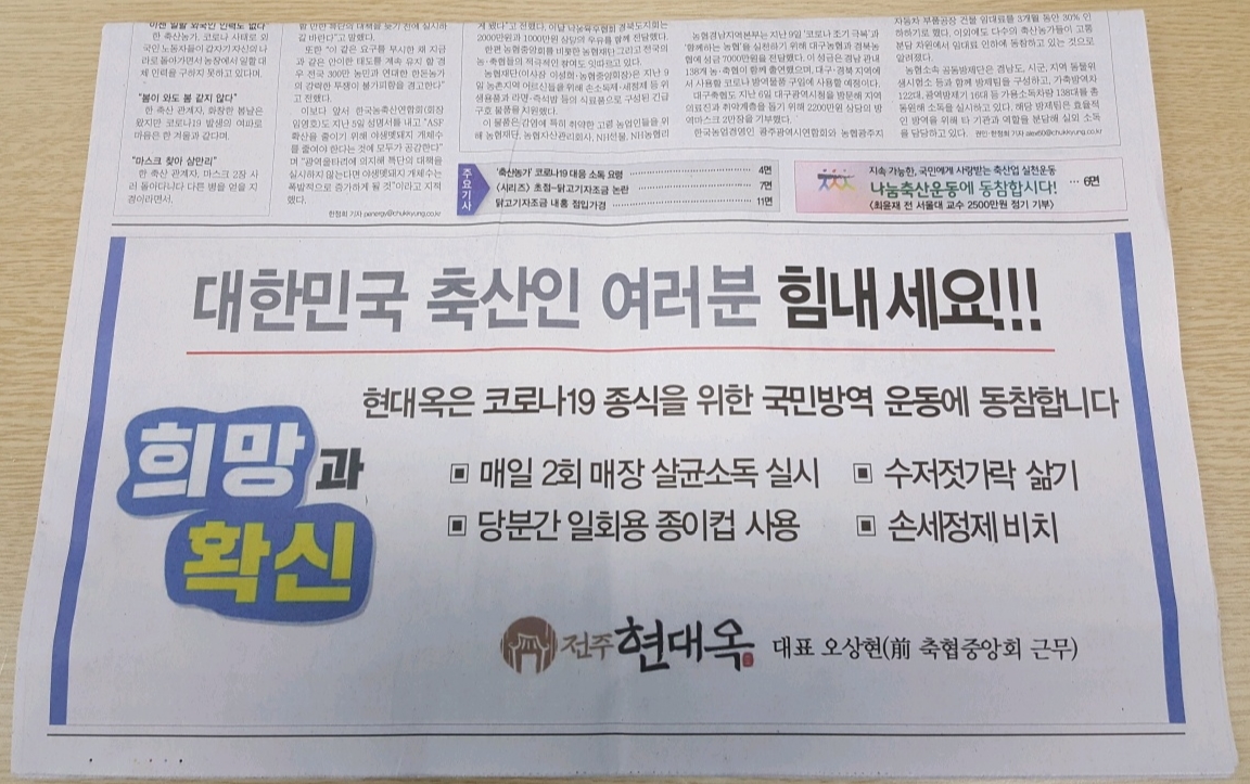 한편, 현대옥에서는 축산분야 전문지인 '축산경제신문'에 "대한민국 축산인 여러분, 힘내세요!!"의 5단 통광고를 3월 16일 오늘자 1면에 게재하였습니다. 축산경제신문은 우리나라 축산농민, 축산물 유통 및 가공업체, 양돈협회 양계협회 등 축산단체, 각급 축산 관련 학계, 농축협의 축산 담당 임직원들이 주요 구독자입니다. 축산경제신문의 구독자들께서는 현대옥광고를 접하면서 현대옥에 대한 우호감을 갖게 됐을 것으로 기대합니다. 축산경제신문에서는 지난 2월에 현대옥대표의 아너소사이티 가입을 뉴스로 보도하였는데, 이 뉴스보도 또한 전국의 축산인들에게 현대옥에 대하여 우호적 이미지를 심어 주었을 것입니다. 아래에 지난 2월의 기사를 링크 붙임하고, 금번 '축산인 여러분 힘내세요'의 광고 사진도 맨아래에 붙여 놓습니다.