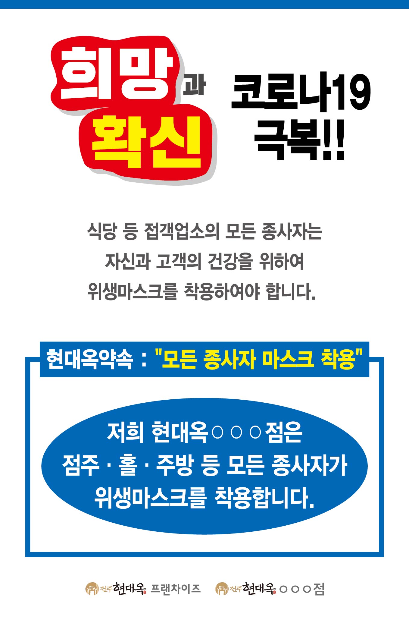 고객들께서는 매장 내 모든 직원들이 마스크를 착용하고 있음과 실내 부착된 현수막을 통하여 마스크 착용 취지를 접하면서 방문 현대옥가맹점에게 신뢰를 보내게 될 것으로 기대합니다.