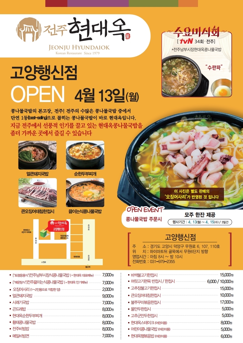 오늘 경기도 고양시 덕양구에 현대옥이 오픈하였습니다. 이제 고양시의 덕양구 주민들께서는 가까운 곳에서 현대옥을 만나 실 수 있게 됐습니다. 맛과 친절위생에 최선을 다하여 주민들께 "우리동네 1등 식당, 현대옥"으로 보답해 드리겠습니다.