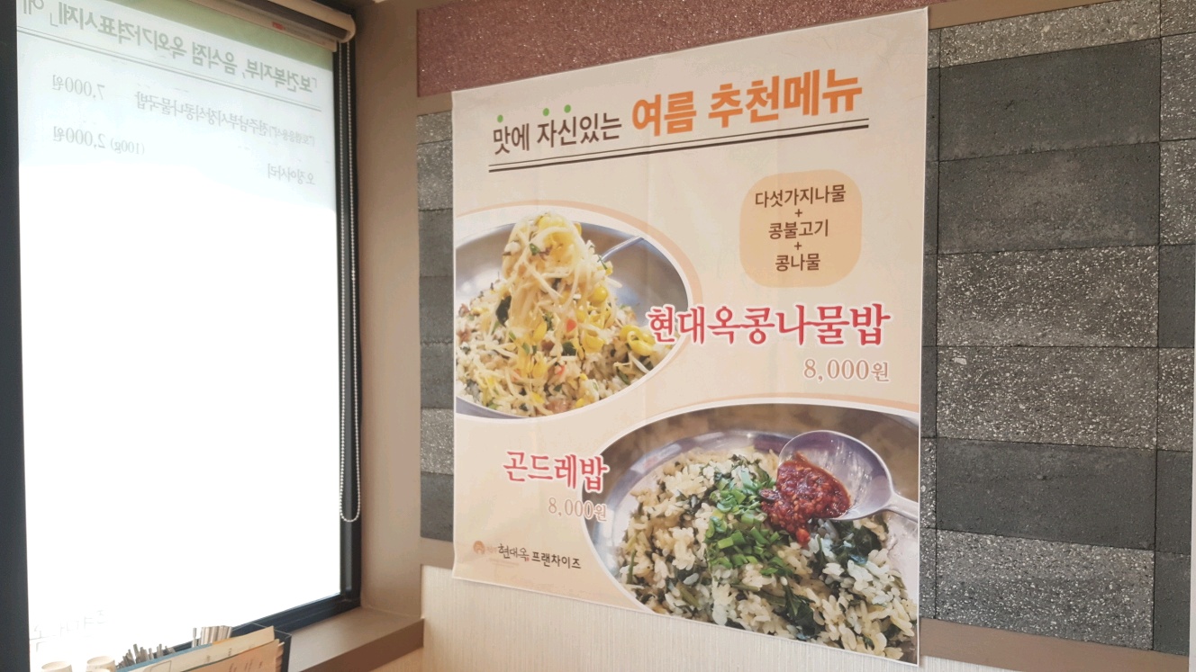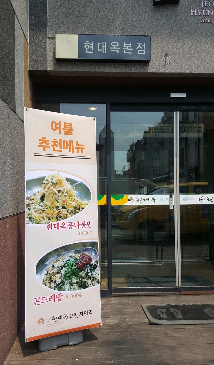 우리 현대옥가맹점에는 여름철 적합 메뉴로 '전주남부시장식콩나물국밥'이외에도 현대옥소바 열무국수 전주비빔밥 현대옥콩나물밥 곤드레밥 별미묵채밥 등이 있습니다. 물론 이 메뉴들에 대한 각 가맹점별 취급 여부는 일부 다를 수 있습니다. 현대옥가맹본부에서는 금년 여름을 맞아 가맹점들이 기존 취급하고 있는 메뉴들 중 '현대옥콩나물밥'과 '곤드레밥'을 '여름 적합 메뉴'로서 적극 활성화하기로 하면서 적극적인 마케팅을 실시하기로 하였습니다. 우선 전주본점에서부터 실내외에 이 두 메뉴에 대한 홍보 부착물을 게시하고 판매를 적극 활성화하고 있는데, 역시 기대에 맞게 많은 고객들께서 이 두 메뉴를 선택하여 주고 계십니다. 가맹본부에서는 일선 가맹점들에 대하여 이 두 메뉴의 판매 활성화를 독려하고 있는데 많은 가맹점에서 호응하리라 봅니다. 저희 현대옥가맹본부는 '가맹점 판매 메뉴'를 '필수판매메뉴'와 '자율선택메뉴'의 두 가지로 구분하여 가맹점에 제시하고 있는데, 위 메뉴들은 가맹점의 자율선택메뉴여서 각 가맹점마다 판매 여부가 다를 수 있습니다. 아래에 두 메뉴에 대한 사진들을 첨부하오니, 이 메뉴들을 널리 사랑하여 주시기 바랍니다. <본점 출입문 비치의 X-배너 사진>