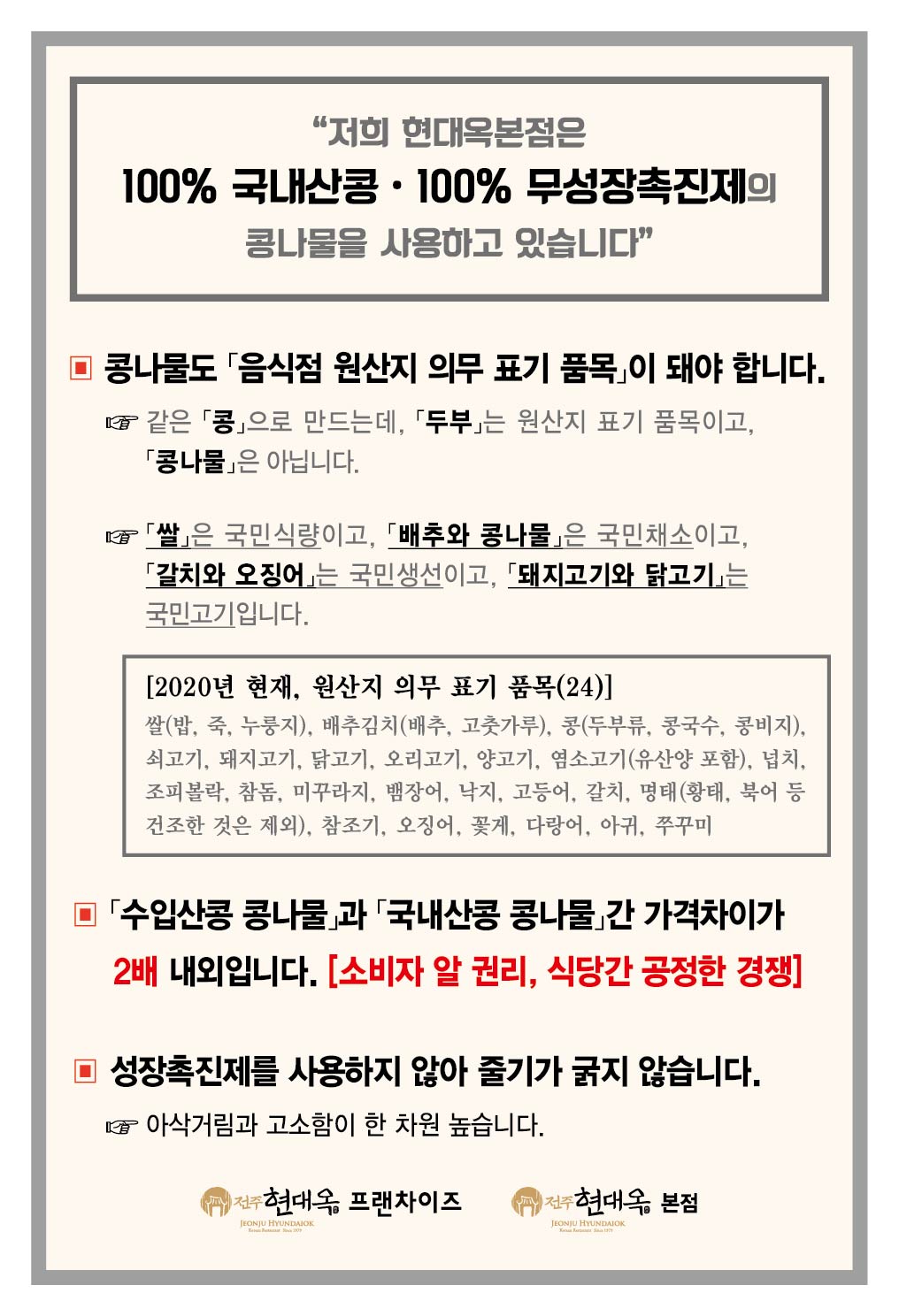 한편, 음식점에서 사용하고 판매하는 콩나물에 대하여는 국가 차원에서 아직 '원산지 의무 표기 품목'으로 지정되어 있지 않습니다. 우리 현대옥에서는 앞으로 콩나물에 대한 원산지 표기 주장을 펼칠 것입니다. 금번 본점에 부착되어 있는 게시물에도 그 주장이 담겨 있습니다. 현대옥을 사랑해 주시는 고객 여러분께서도 크게 응원해 주시길 바랍니다. '콩나물콩 원산지 표기'에 대한 좀 더 구체적 주장은 현대옥홈페이지-->자료실-->'현대옥에서 드리는 글'에 금명 실어 놓겠습니다.