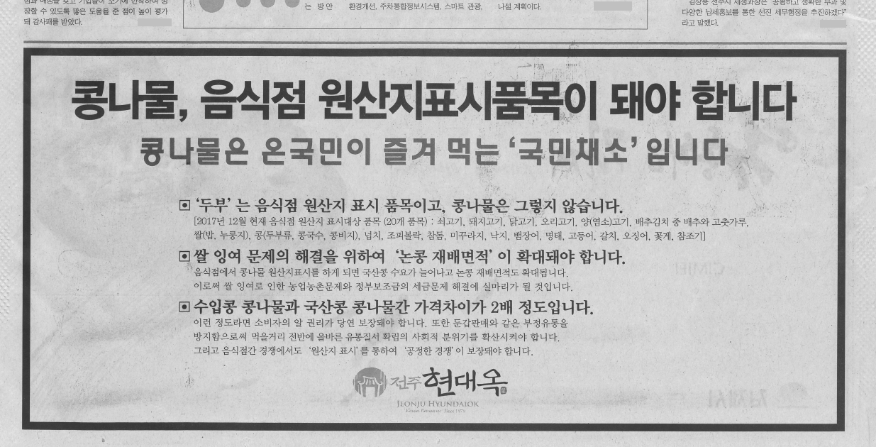 <'콩나물 원산지 표기' 관련 2017년 12월 전북지역 일부 지방일간지 광고 사본>