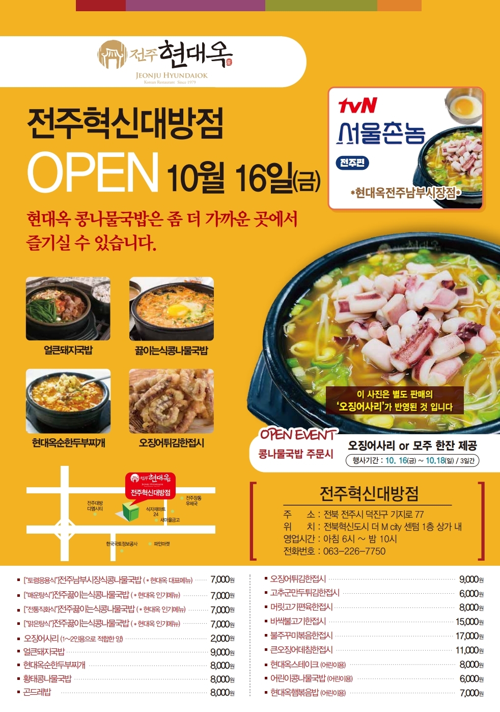 혁신도시 내 국민연금 농촌진흥청 등의 공공기관 임직원들과 그 가족들께서도 이제 가까운 곳에서 현대옥을 만나 실 수 있게 됐습니다. 맛과 위생친절에 최선을 다하여 "전북혁신도시 1등식당, 현대옥"으로 보답해 드리겠습니다.