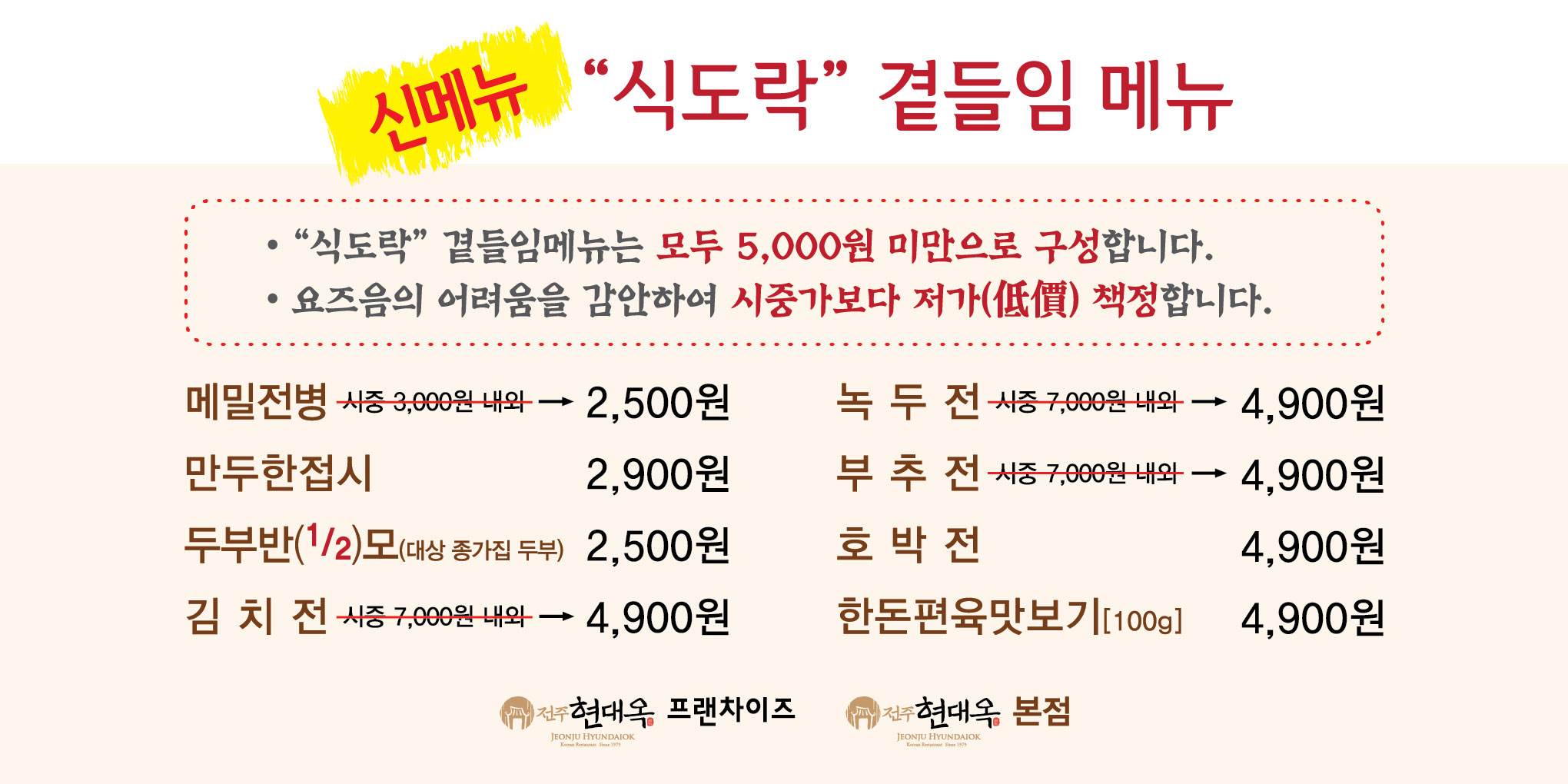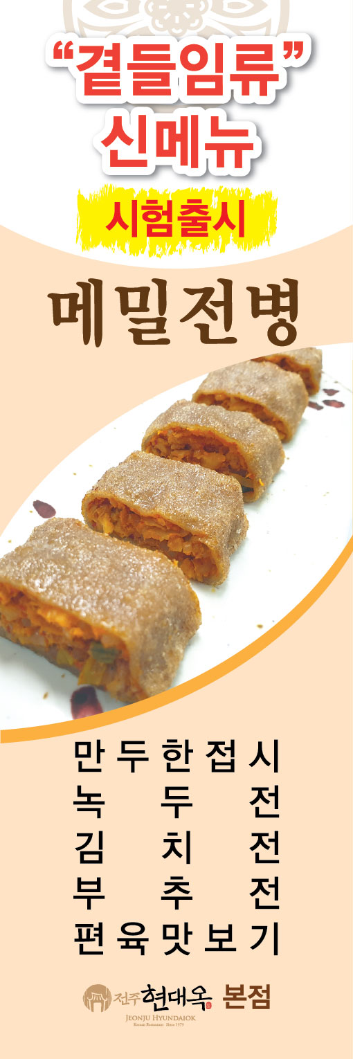 오늘부터 전북전주 소재 '현대옥본점'에서는 메밀전병 등 8가지의 "초저가 곁들임류" 신메뉴를 시험 출시하고 있습니다. 앞으로 한달간 시험 판매를 한 다음 제반 문제점을 보완하여 11월 중 가맹점에서 출시할 계획입니다. 가맹점 출시 과정에서 금번 신메뉴 품목이 증감할 수도 있을 것입니다.