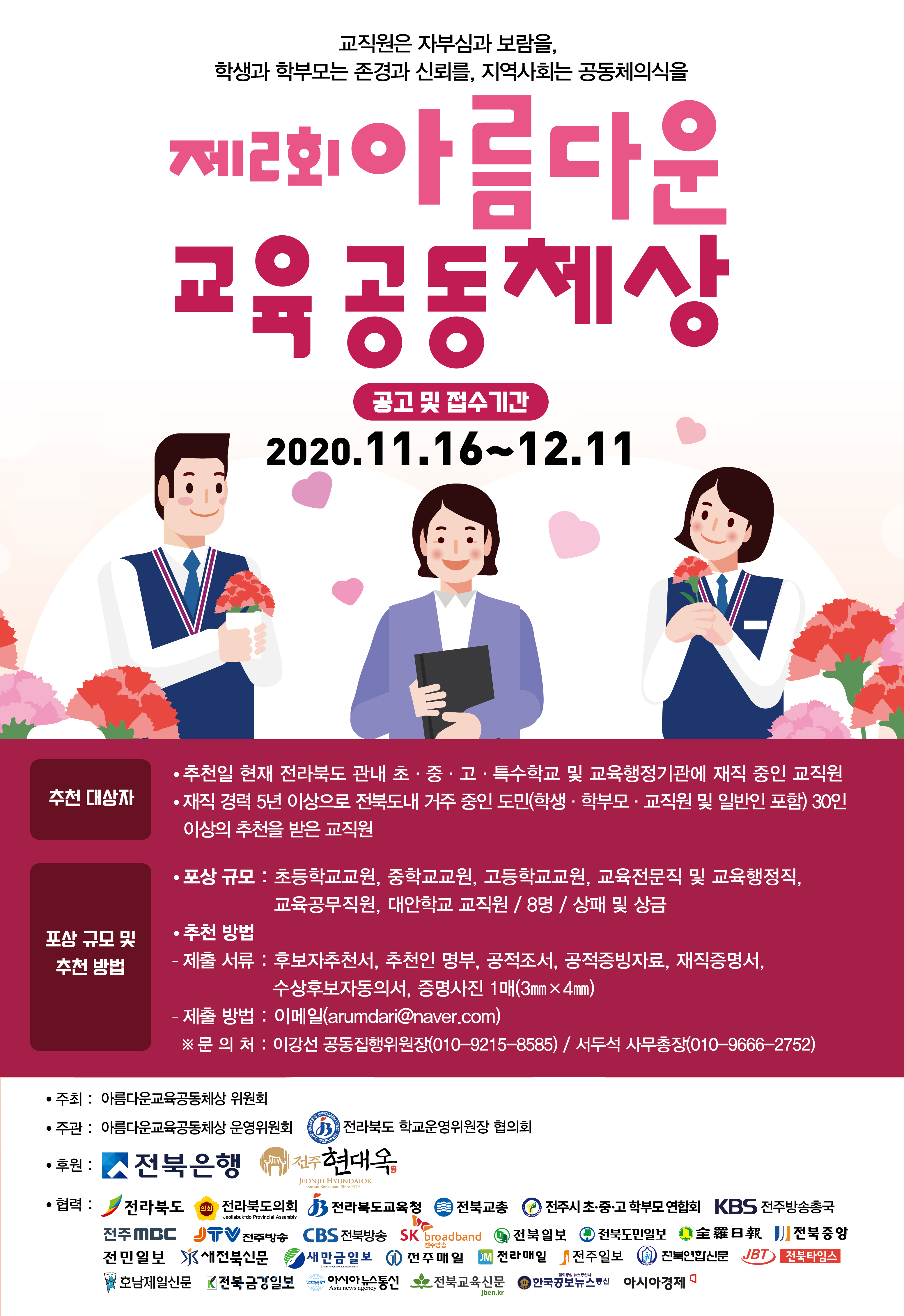 매년 년말 "교직원은 자부심과 보람을, 학생과 학부모는 존경과 신뢰를, 지역사회는 공동체 의식을"의 슬로건으로 전라북도 내 모든 초, 중, 고, 특수학교, 교육행정기관에 재직 중인 교직원을 대상으로 수상자를 선발하는 '아름다운 교육 공동체상'에 저희 현대옥이 작년에 이어 금년에도 후원 참여합니다. 작년에는 전주시 내 소재의 초중고 특수학교를 대상으로 하였는데, 금년부터는 전라북도 전체로 확대하여 실시됩니다. 행사를 알리는 포스터가 전북권 현대옥가맹점과 전북은행 전북권 모든 지점에 부착되고, 전북권 각급 학교 등에도 포스터가 게시됩니다. 특히 동 행사에는 전북권 내 방송사와 신문사 등의 거의 모든 언론사가 협력 참여하는데 이를 통해 전북권 내 언론에 적극 노출됨으로써 현대옥의 위상을 널리 알리게 될 것입니다. 금번 상을 통하여 전북권 내 가맹점들의 영업력 향상도 일정 지원될 것으로 기대됩니다. 아래에 금번 행사의 포스터를 첨부해 놓으니 이 상에 관심있는 분들은 포스터를 참고하여 참여하시면 됩니다.