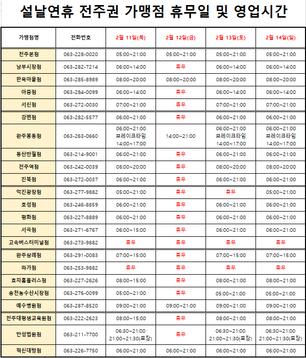 설연휴기간 전주권 현대옥의 영업시간을 아래 첨부와 같이 안내드립니다.