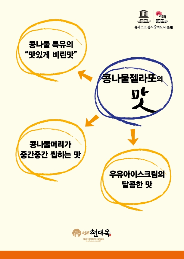 지난 4월 14일 현대옥본점 앞 카페에서 야심차게 출시한 콩나물젤라또가 출시 당일부터 "건강한 맛이다 아니다 비리다."의 호불호의 양분된 평가가 나왔었습니다. 가맹본부에서는 이러함을 예의주시하다가 50%의 선호를 넘어 100%를 지향하면서 며칠 후 레시피를 수정하여 비린맛을 일정 줄이는 보정을 하였었는데, 이후에는 고객반응이 상당히 호전되어 호불호의 중간에서 대체적으로 호의 영역 쪽으로 이동되어 있다고 판단합니다. 비린맛에 거북스러워함을 표하는 고객은 비린맛을 내려 무슨 첨가제를 넣은 것은 아닌가의 질문도 하곤 합니다. 저희 콩나물젤라또는 콩나물맛을 내려고 어떤 첨가제도 넣지 않고 오로지 콩나물로만 비린맛을 내고 있음을 밝힙니다. 콩나물젤라또의 성공을 위해서는 맛 뿐만 아니라 고객의 이해를 구하는 설명이 필요하다고 판단되어 콩나물젤라또의 생소한 맛이 건강한 맛이라는 개념의 안내장을 만들었고, 이 안내장을 콩나물젤라또 주문 고객들 마다에 한장씩 전달하고 있습니다. 현대옥가맹본부는 콩나물젤라또와 순두부젤라또 현대옥식혜 등의 현대옥디저트류에 대하여 지속적인 홍보를 통하여 반드시 성공시켜 놓을 것입니다. 본점 앞 현대옥카페에 콩나물젤라또를 홍보하는 현수막을 게첨하고 있는데, 이 현수막에 현대옥외식사업의 정체성과 철학을 표현하는 문구로서 "새는 날도록 태어 났고 인간은 고생하도록 태어 났다면, 우리는 맛있는 음식을 먹을 때 고통을 잊고 치유를 받는 것이 아닐까. 현대옥은 늘 새로운 음식, 늘 맛있는 음식에 도전합니다."를 새겨 넣었습니다. 이를 통하여 고객들께 현대옥의 진정성과 도전정신이 잘 전달되기를 기대합니다. 아래에 안내장과 현수막 사진을 붙임해 놓습니다. <전단지 앞면>